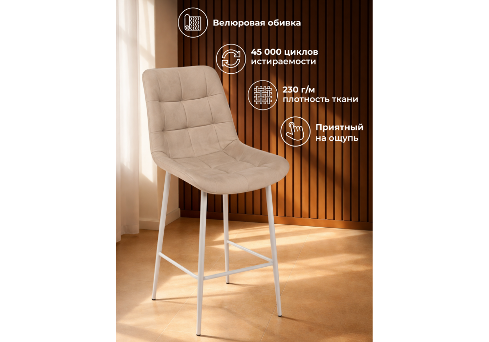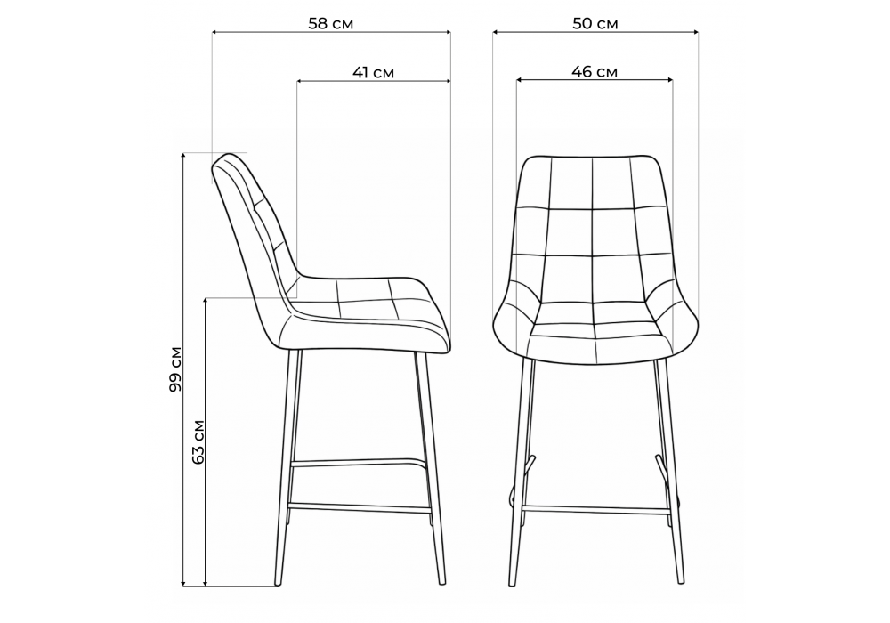 Материал каркаса - металл; Материал сиденья - велюр; Материал обивки - велюр; Цвет ножек - серый; Ширина - 50; Глубина - 58; Высота - 99; Ширина сиденья - 46; Глубина сиденья - 41; Высота сиденья - 63;