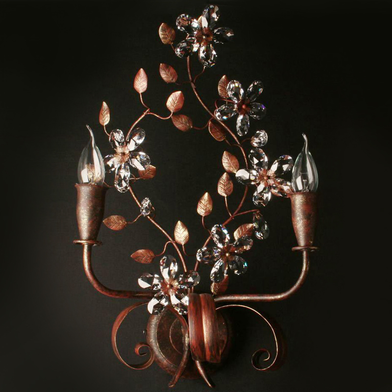 Бра 2-х рожковое из коллекции MALVA на арматуре из кованного металла с декоративными завитками и ветвями.Декор: кристаллы Swarovski в виде цветов. Цвет арматуры: черно-бордовый с золотыми потертостями. По индивидуальному заказу возможны различные модификации и варианты отделки. Примеры цветовой палитры представлены в разделе PDF каталогов.