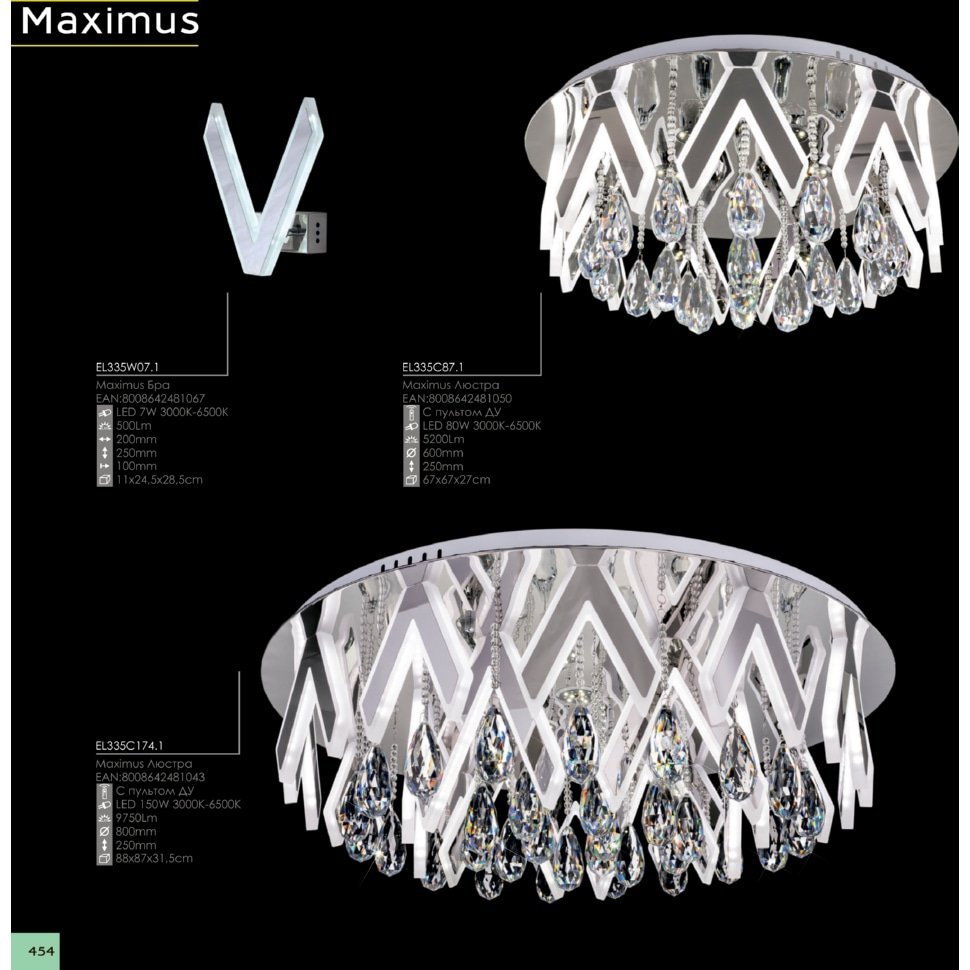 - Дополнительная информация: Регулировка яркости и цветовой температуры в диапазоне 3000-6500К, с пульта, входящего в комплект люстр серии. Возможность управления основными режимами с настенного выключателя.