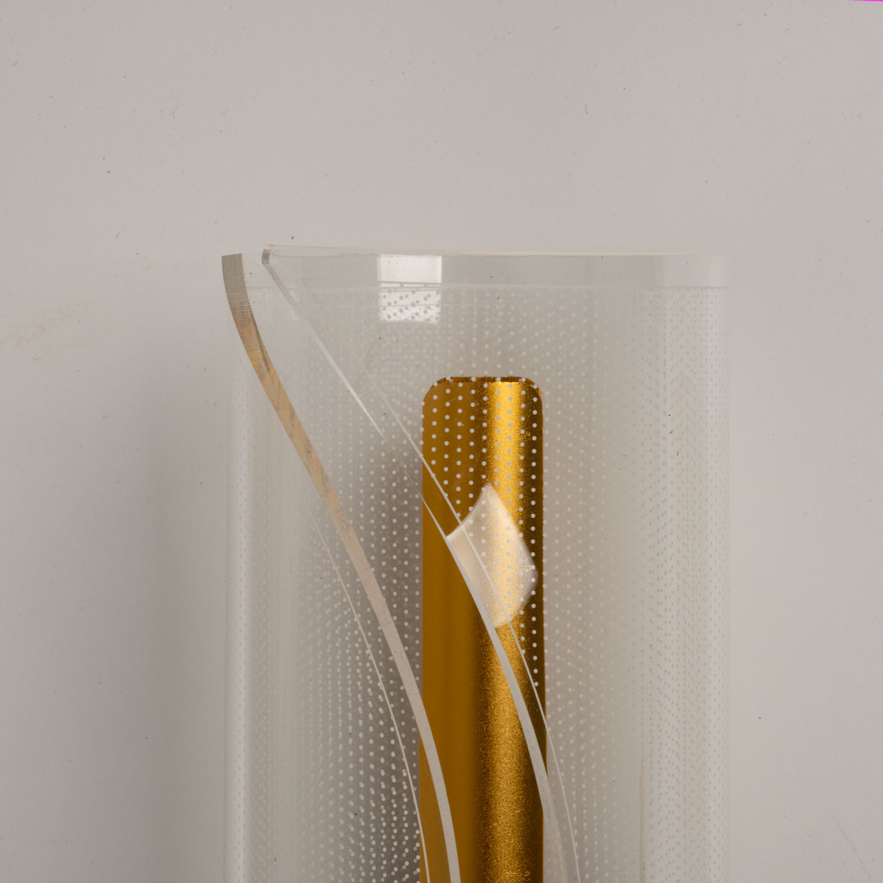 Металлический корпус настенного бра окрашен в черный цвет. Корпус плафона выполнен из сплава алюминия и окрашен в цвет золота. Настенное бра декорировано изящным элементом из прозрачного акрила с точечным рисунком.