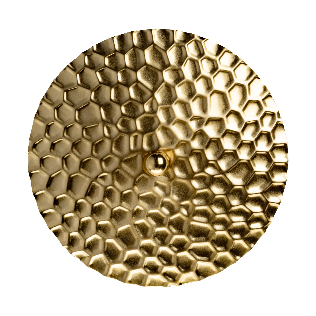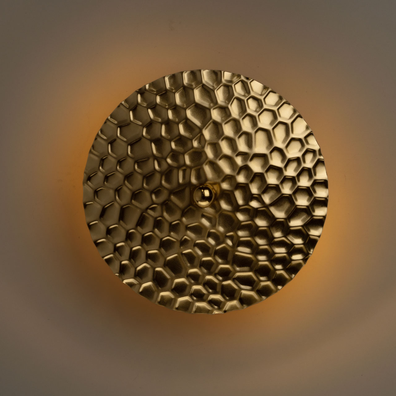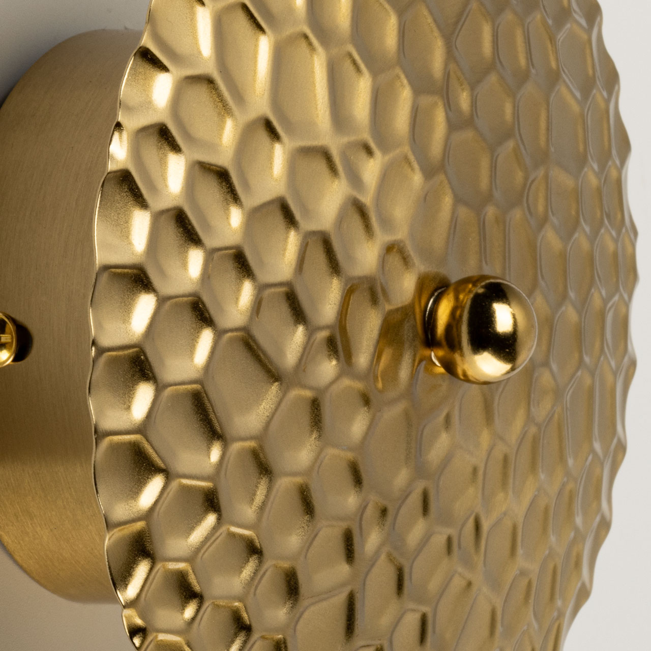 Металлическое основание настенного бра гальванизировано в цвет латуни. Плафон выполнен из сплава алюминия с цинком и гальванизирован в цвет основания. Настенное бра декорировано плафоном из металла с рельефной текстурой.