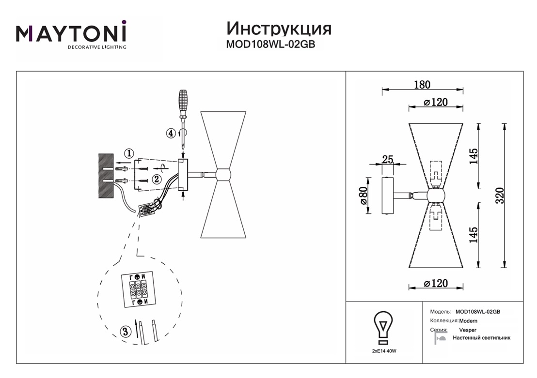 Бра Maytoni Vesper MOD108WL-02GB — это модель, которая сочетает в себе сдержанную роскошь и лаконичные формы, органично дополняя интерьерное пространство. Благодаря 2 источникам света с типом цоколя E14 и мощностью 40 Вт каждый, этот осветительный прибор обеспечивает общую мощность устройства 80 Вт, что позволяет создать комфортное и равномерное освещение на площади в 4 квадратных метра, создавая уютную атмосферу в вашем доме.
