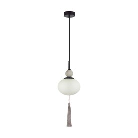 Линия светильников GLORIYA привлекает внимание необычной формой плафонов в виде элипсоида и керамики в виде фактурных шарообразных элементов бежевого или серого цвета. Изящная арматура в латунном или черном цвете объединяет все элементы и венчается шелковой съемной кисью в центре всей композиции.