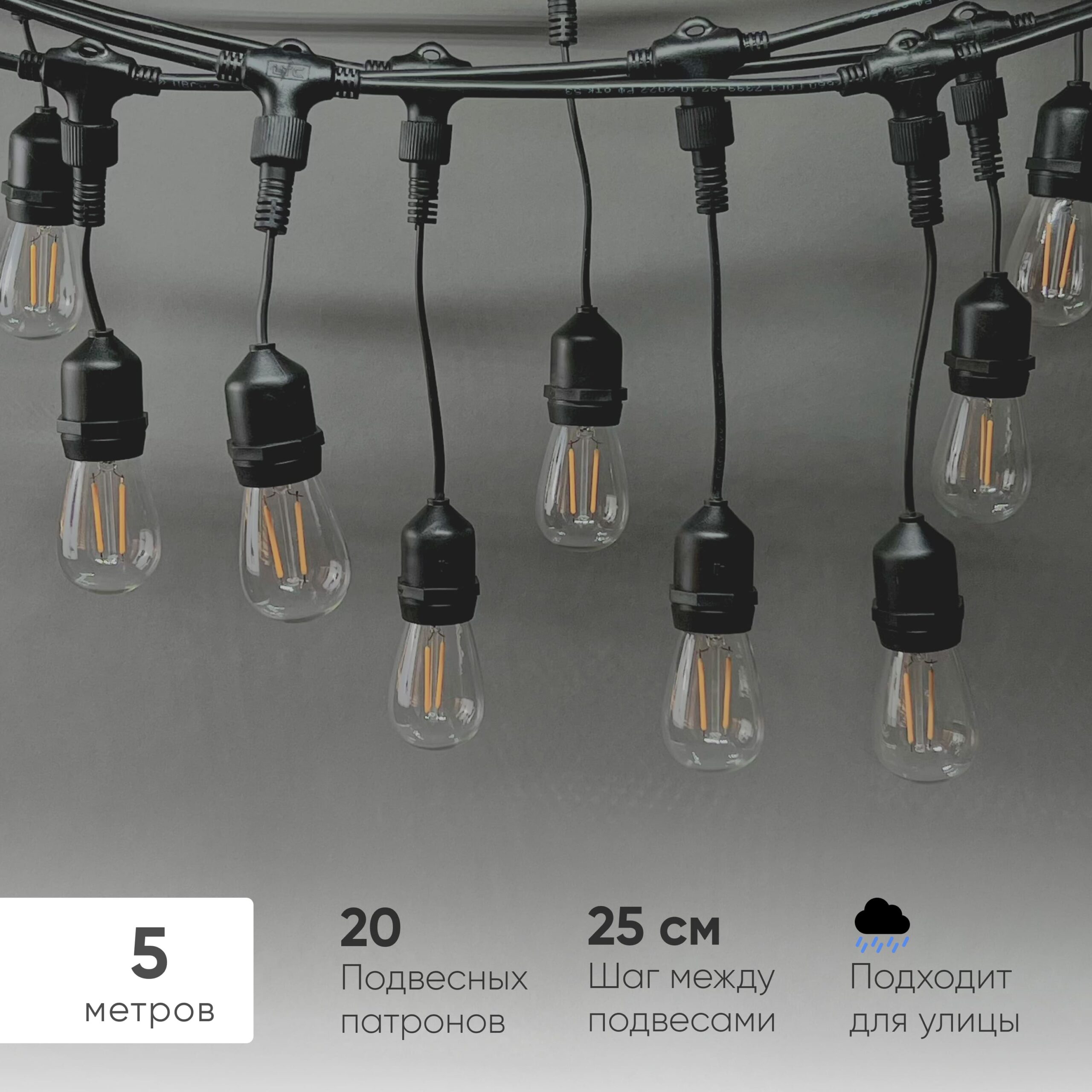 Белт-Лайт UNIBELT 5м, Провод Черный Каучук, Шаг 25 см, 20 Подвесных Патронов, IP65 LTC UBL5m/20L-1 в Томск