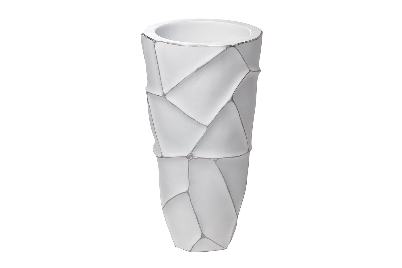 Необычное кашпо белого цвета предназначено для установки искусственных цветов и различных комнатных растений в горшках. Напольное кашпо для цветов представляет собой глубокий сосуд из прочной полисмолы. Модель выполнена в стиле современного ар-деко и гармонично смотрится в любом современном интерьере. Дизайн кашпо выполнен с интересным декоративным приемом - в виде склеенных осколков и серебристых прожилок. Белый цвет является универсальным и приятным для глаз. Представленное напольное кашпо можно устанавливать в комнатах, больших холлах, офисах и закрытых верандах.