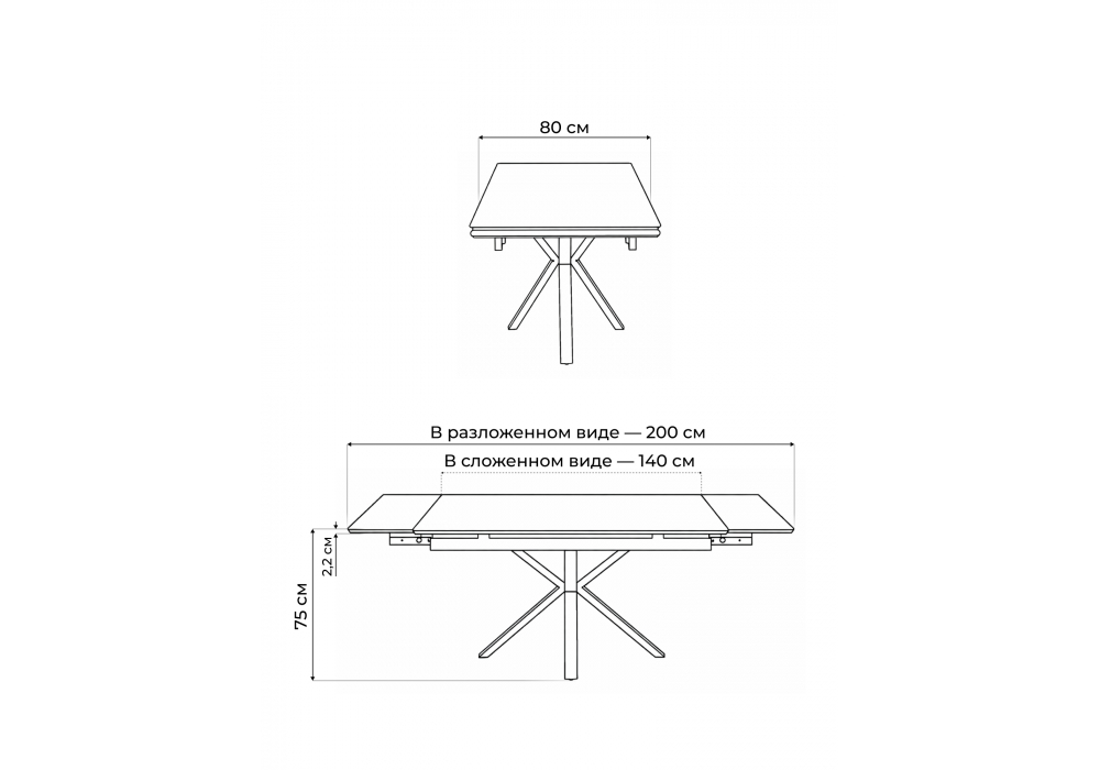 Материал каркаса - металл; Материал столешницы - Керамика; Цвет ножек - черный; Ширина - 80; Высота - 75; Длина стола в разложенном виде - 200; Длина - 140;