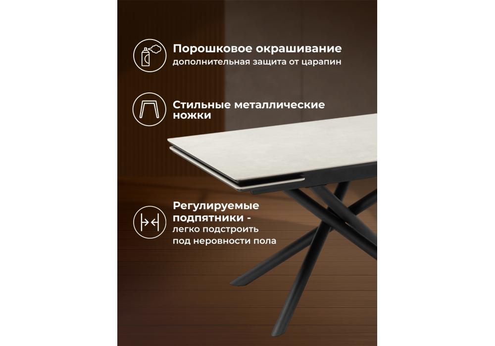 Материал каркаса - металл; Материал столешницы - Керамика; Цвет ножек - черный; Ширина - 80; Высота - 75; Длина стола в разложенном виде - 180; Длина - 120;