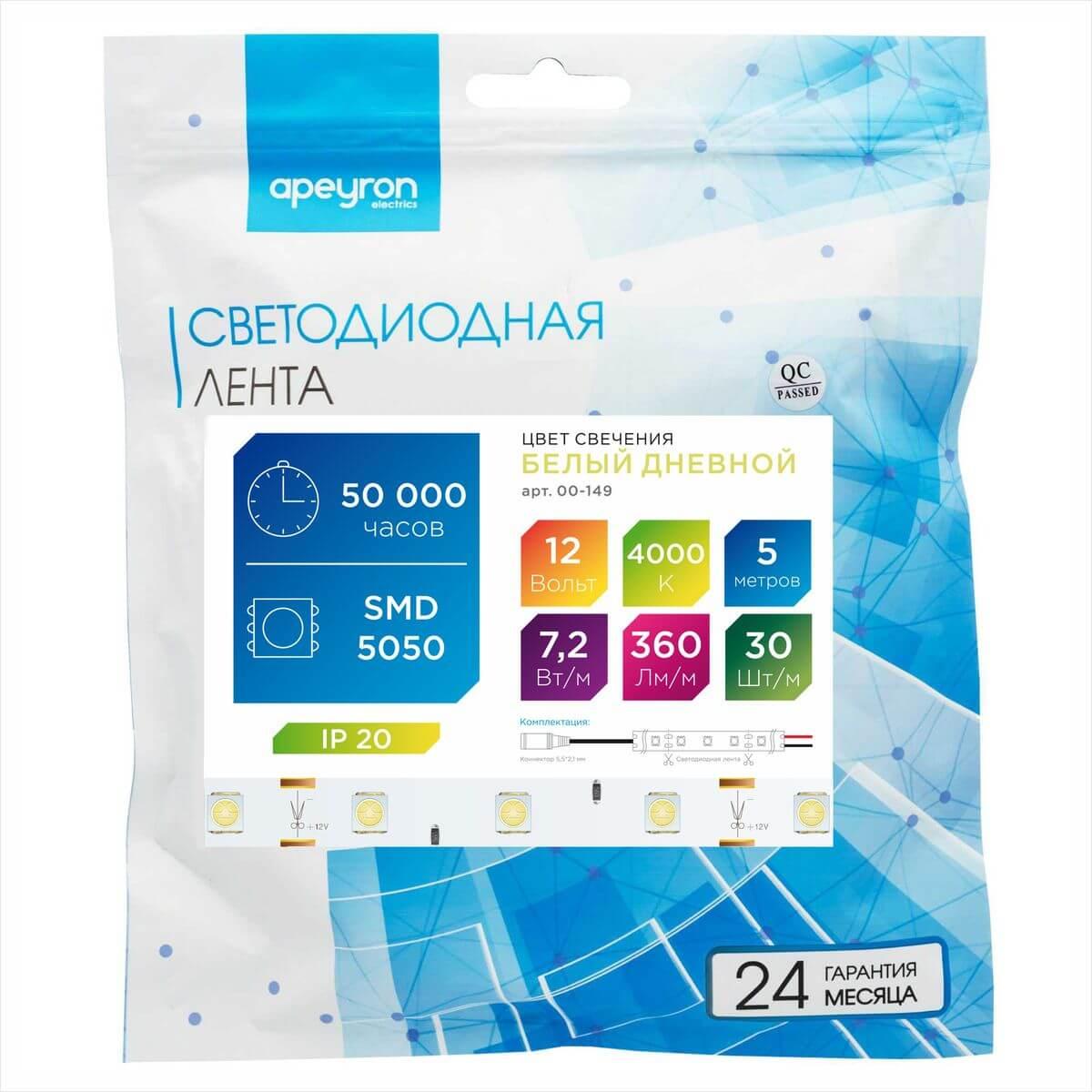 Лента Apeyron 7, 2W/m 30Led/m 5050SMD дневной белый 5M 00-149 в Томск