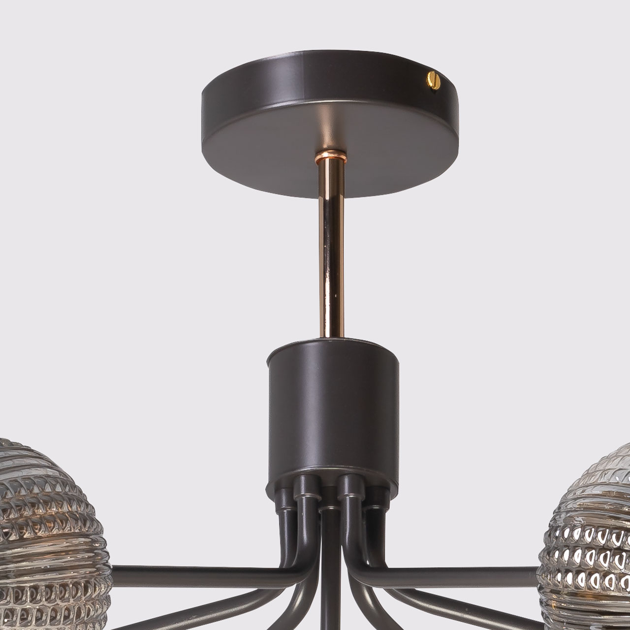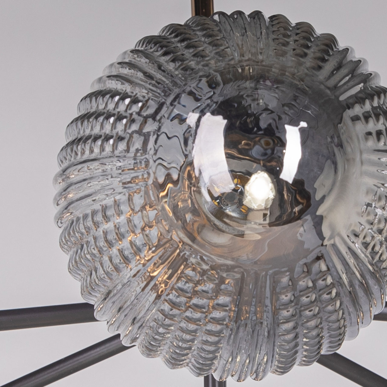 Металлическое основание потолочной люстры окрашено в цвет кофе. Отдельные элементы основания гальванизированы в цвет золота. Плафоны выполнены из фактурного стекла, отлитого в сложную форму и гальванизированного в дымчатый металлизированный цвет.