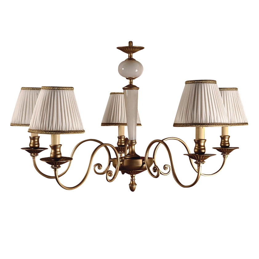 Люстра из коллекции I Nobili - Alabastro. Текстильные абажуры белого цвета. Позолоченная основа с декором из камня алебастра белого цвета. Высоту люстры можно регулировать за счет звеньев цепи.