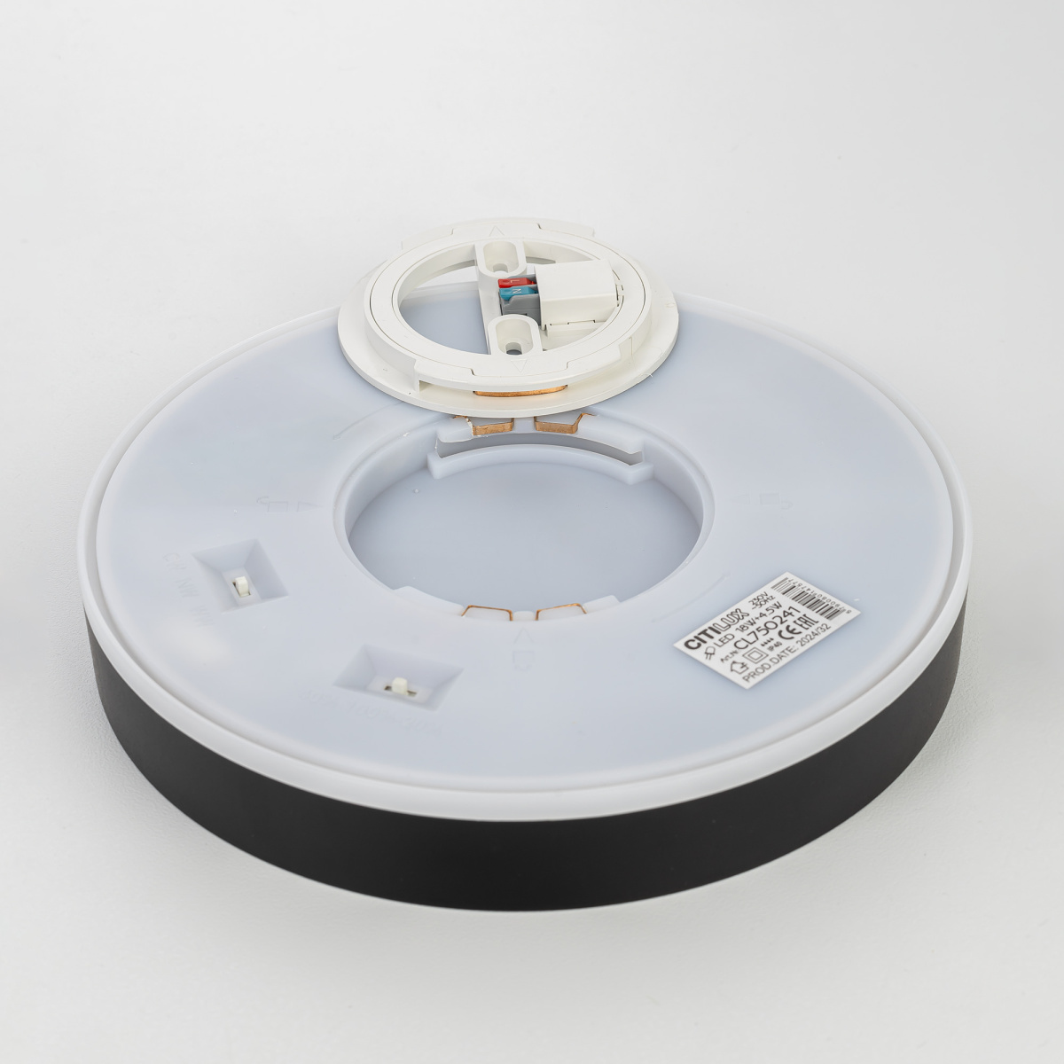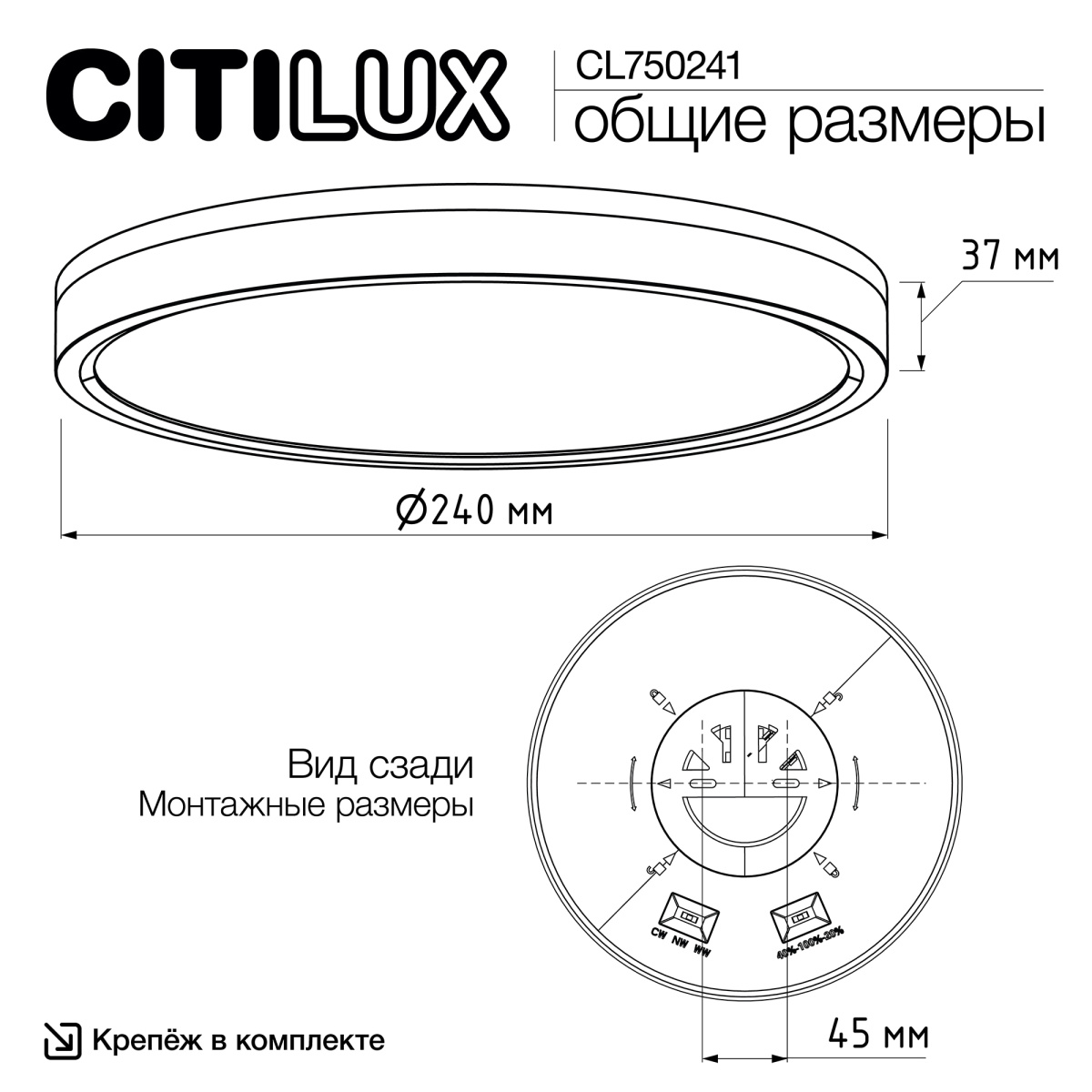 Изделие обладает высокой энергоэффективностью основного света – 120Лм/Вт, осветит до 9м². Мощность: основной свет - 18Вт, потолочная подсветка – 4,5Вт. Диаметр 24см, высота 3,5см. Тип крепления – удобная монтажная платформа. Исключительно лёгкий монтаж!