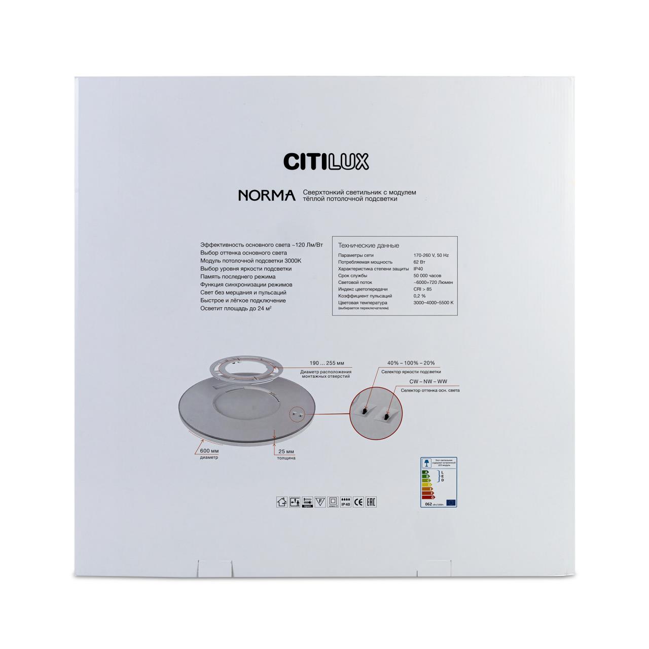 Изделие обладает высокой энергоэффективностью основного света – 120Лм/Вт, осветит до 24м². Мощность: основной свет - 50Вт, потолочная подсветка - 12Вт. Диаметр 60см, высота 2,5см. Свет безопасный для глаз, без мерцания и пульсаций. Тип крепления – удобная монтажная платформа.