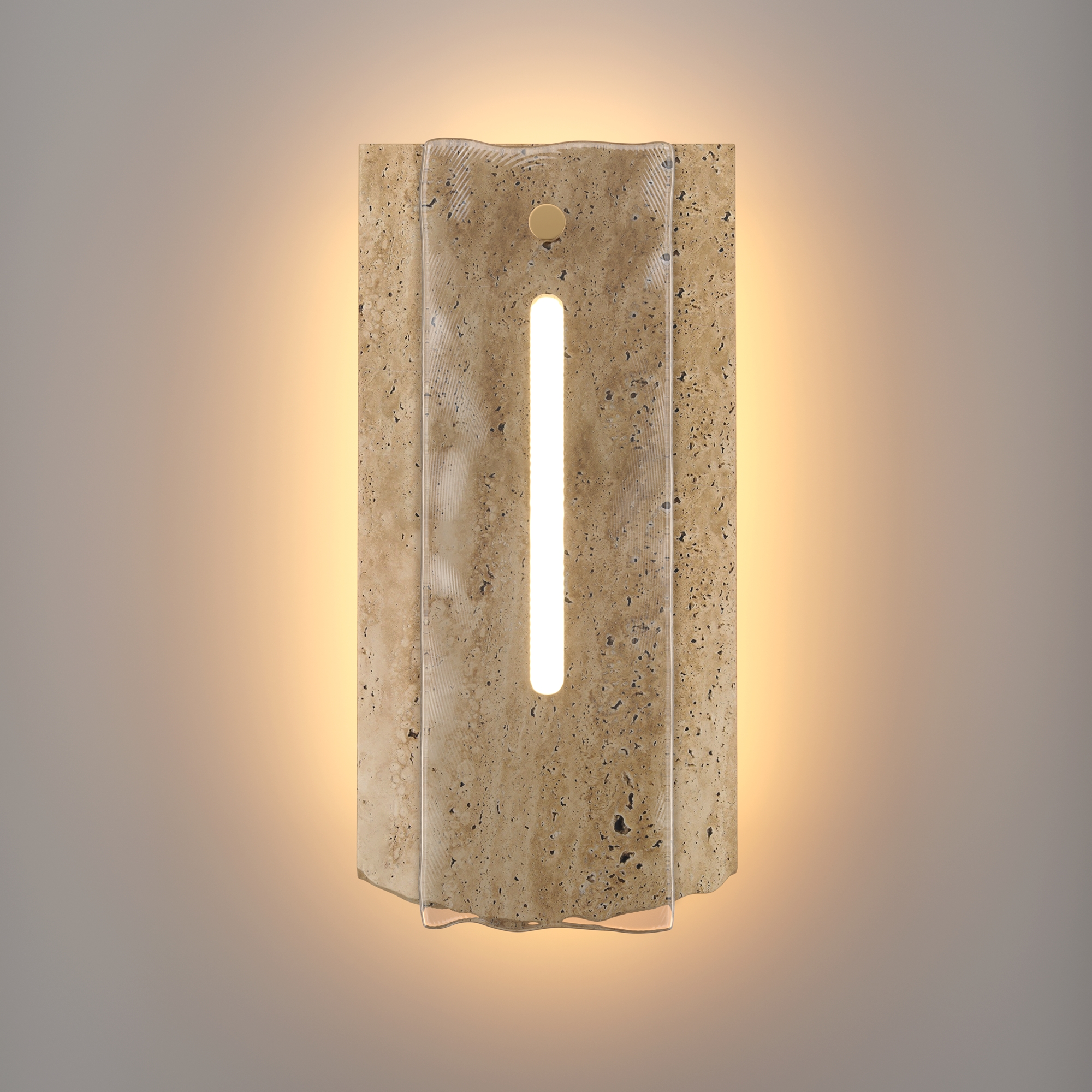 Характерный для серии контраст фактур: пористый травертин бежевого оттенка, металл цвета крашеной латуни и глянцевое стекло с «мятым» волнообразным паттерном. LED-источник (3000К) по контуру создаёт ореол на стене и подсвечивает стекло изнутри. Крафтовая обработка с неидеальными краями и лёгкой асимметрией придаёт каждому изделию эффект рукотворной эксклюзивности. Универсальны для современных жилых и коммерческих интерьеров. Эффектны как одиночный акцент и в композициях.