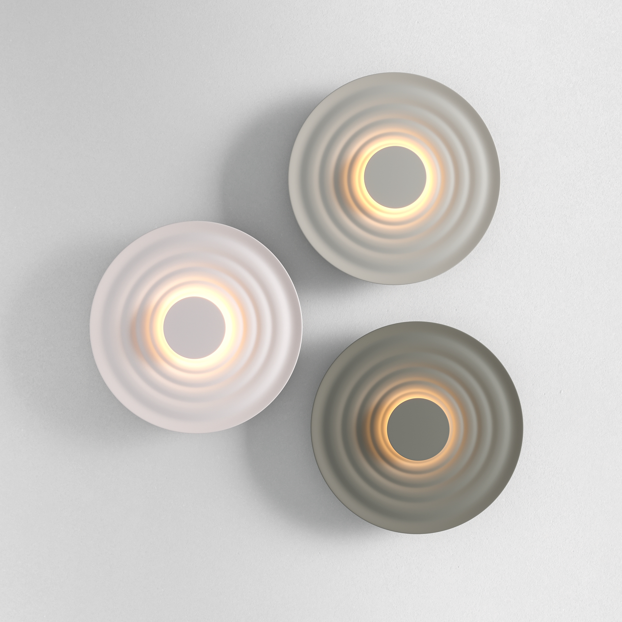 Светильники, вдохновленные японским садом камней и движением ветра. Волнообразные формы с матовой антибликовой поверхностью. Материал арматуры — алюминий. LED-источник света с температурой 3000К. Доступны в трех цветах: белый, серый, хаки. Переотраженный свет для создания мягкого освещения. Возможность составления различных композиций.