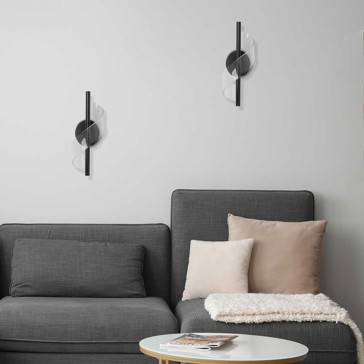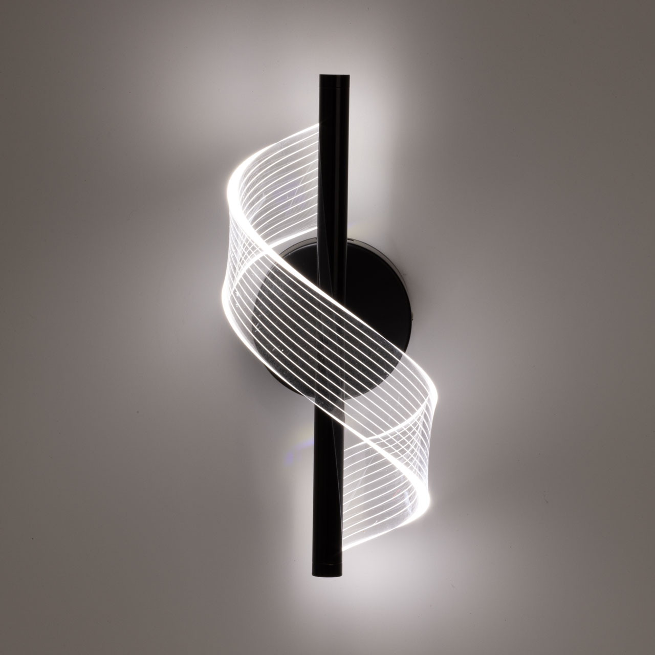 Черный цвет основания настенного бра привлекает к себе внимание и эффектно выделяет вертикальное бра на стене. Оригинальный плафон из прозрачного акрила в виде закрученной ленты делает настенное бра арт объектом. Многорежимность с изменением цветовой температуры от 3000К до 6500К является элементом светодизайна и позволяет подобрать комфортную температуру света. Качественные светодиоды и корпус из сплава алюминия обеспечивают яркое освещение и долгий срок службы. Светодиодные источники света экономичны и безопасны.