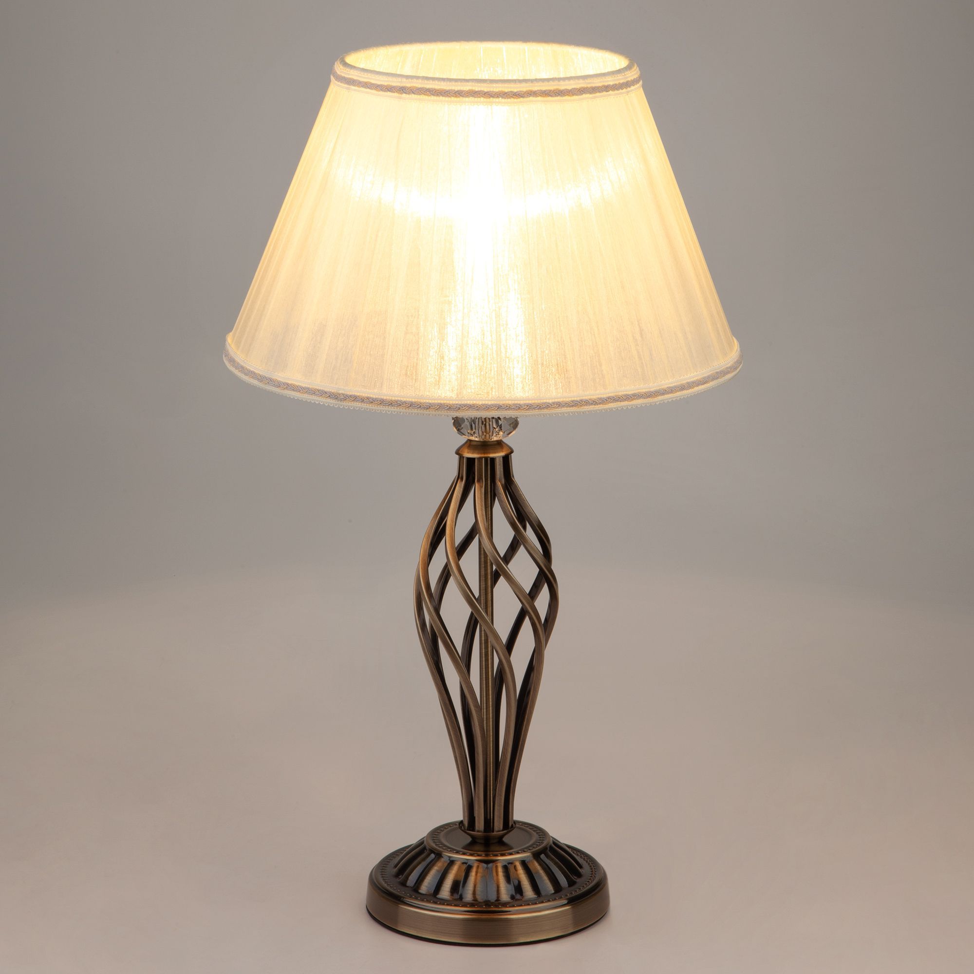 Благодаря бежевому тканевому абажуру настольная лампа создает мягкое рассеянное свечение, подходящее для комфортного чтения книг в вечернее время. Прочный металлический корпус светильника устойчив к механическим воздействиям, а защитное покрытие обеспечивает надежную электроизоляцию и презентабельный внешний вид.
