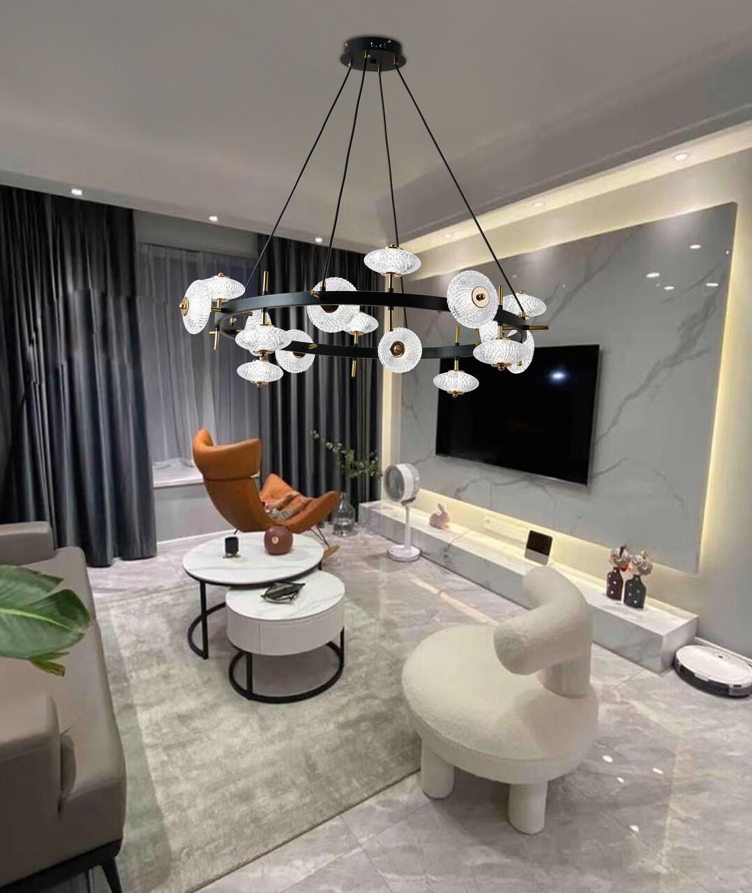 Подвесная люстра артикул F1324-13 - это стильное и современное освещение, которое станет украшением любого интерьера. Изготовленная из высококачественных материалов, таких как алюминий и акрил, она обладает долгим сроком службы и надежностью. Светодиодные лампочки обеспечат яркое и энергоэффективное освещение, а 16 ламп создадут комфортную атмосферу в помещении. Цветовая гамма включает в себя жемчужный черный, золотистый и белый, что позволяет подобрать люстру под любой интерьер.