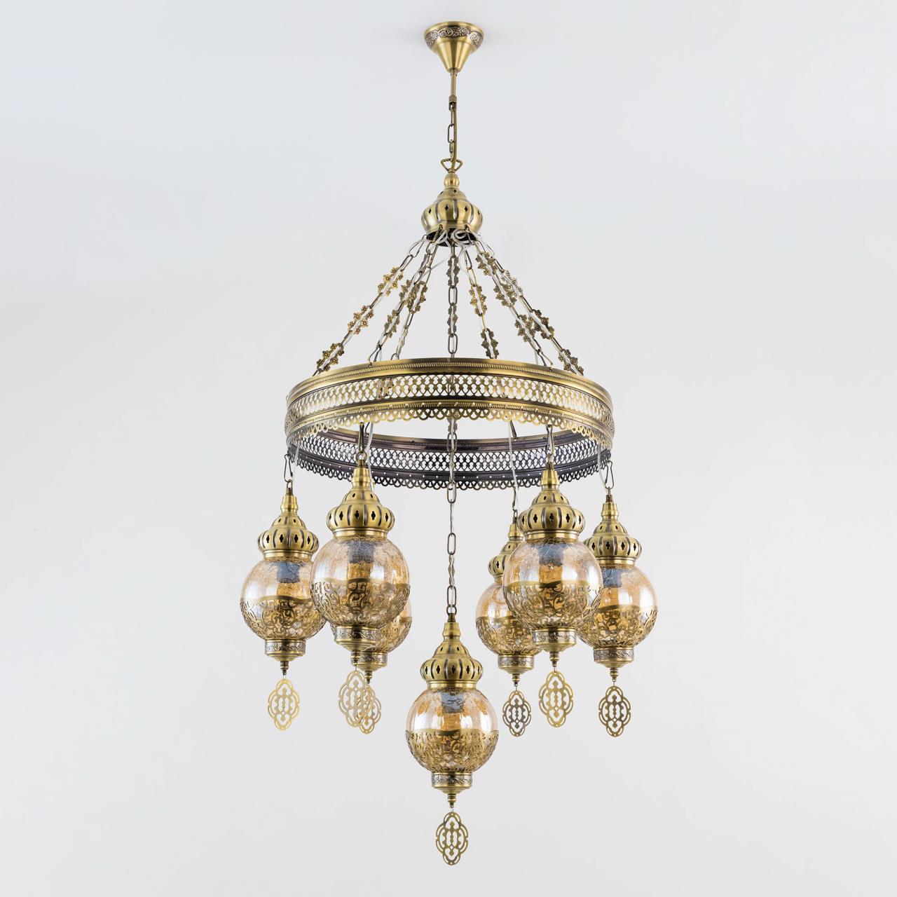 Восточная каскадная люстра CL419163 , страна бренда Дания , производитель Citilux , модель CL419163 относится к коллекции Каир с семью подвесными плафонами. Каркас металлический, цвет бронза. Плафоны в форме шара, изготовлены из прозрачного стекла медового оттенка, украшены декоративными, ажурными элементами. В изделии используются лампы с цоколем Е27, максимальной мощностью для ламп накаливания 75Вт. Светодиодные лампы можно устанавливать более яркие. Модель подходит для всех типов потолков, в том числе натяжных. Тип крепления – крючок. Люстра Каир CL419163 прекрасный вариант для атмосферного освещения интерьеров квартир и загородных домов, выполненных в восточном стиле. Это великолепное решение при оформления уютных кафе, баров и ресторанов. Купить модель CL419163 спешите в интернет магазине 220svet.ru