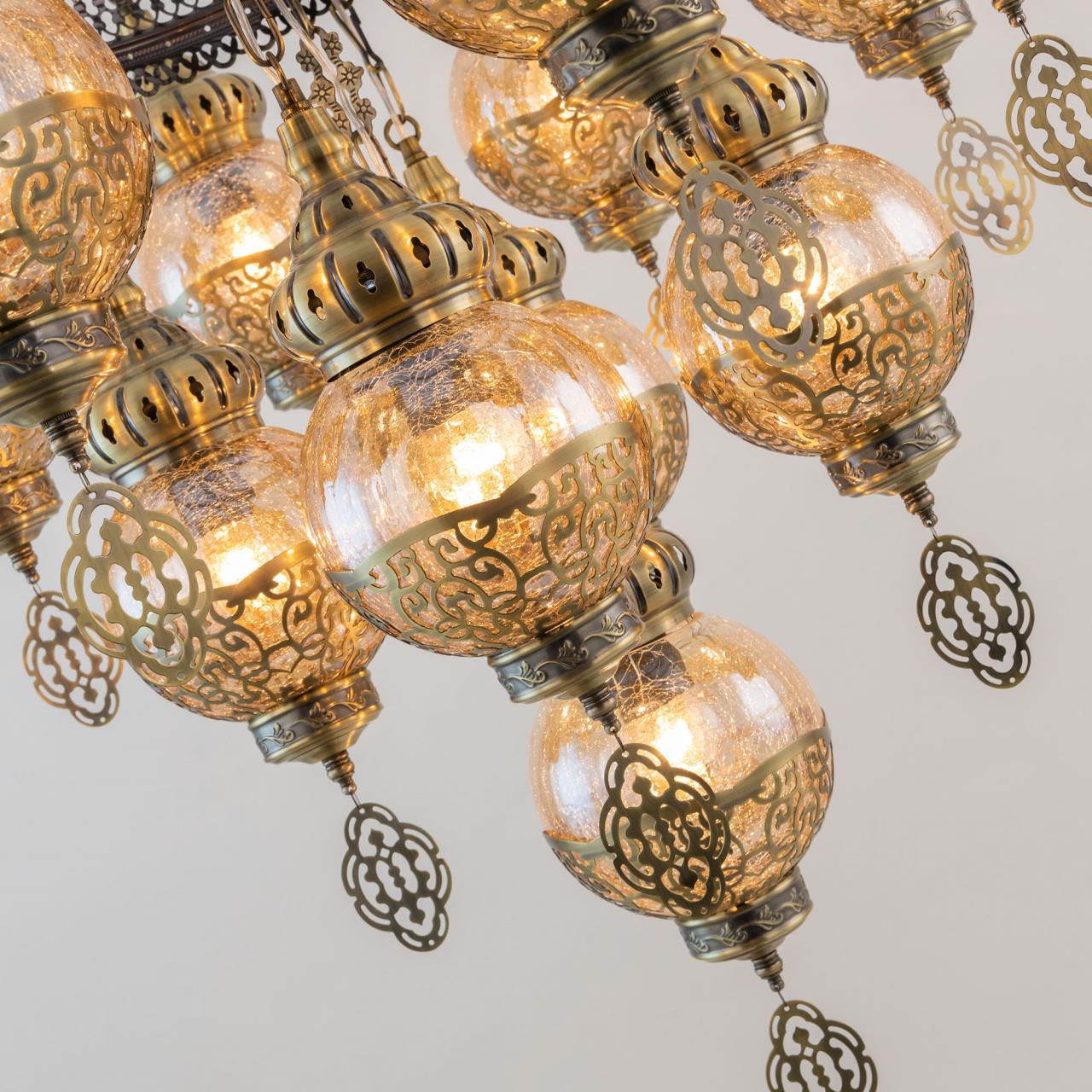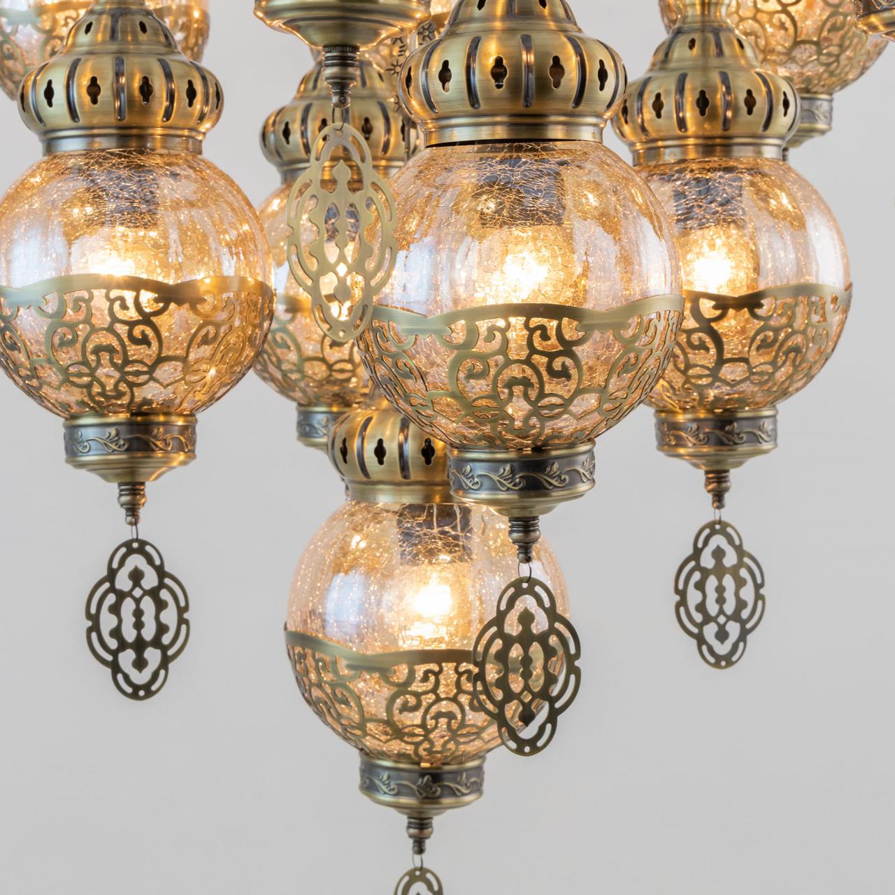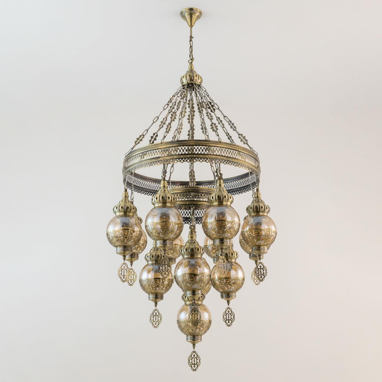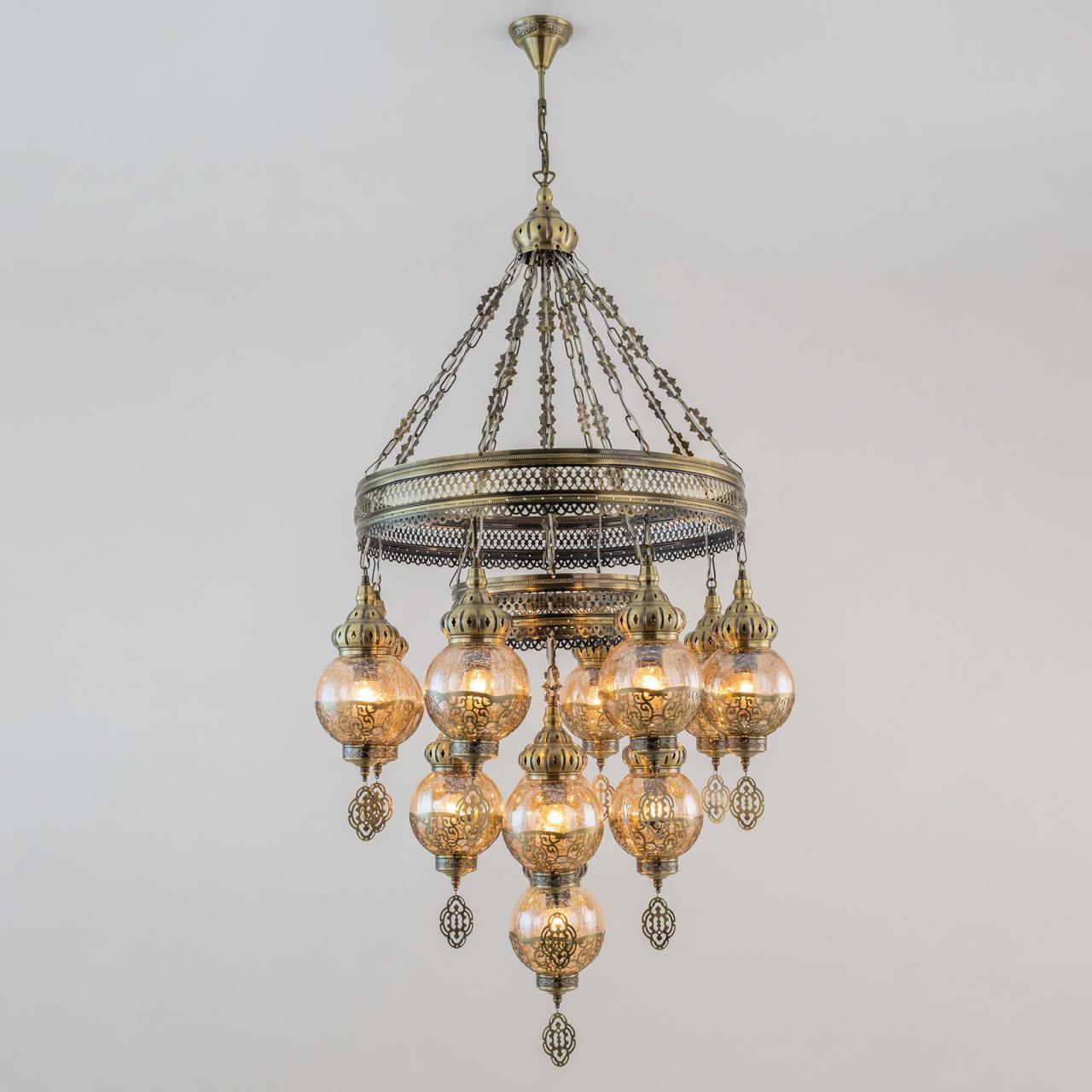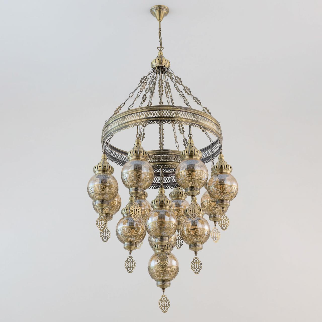 Восточная двухъярусная каскадная люстра CL419193 от производителя Citilux принадлежит к коллекции Каир с тринадцатью подвесными плафонами. Каркас металлический, цвет бронза. Плафоны в форме шара, изготовлены из прозрачного стекла медового оттенка, украшены декоративными, ажурными элементами. В изделии используются лампы с цоколем Е27, максимальной мощностью для ламп накаливания 75Вт. Светодиодные лампы можно устанавливать более яркие. Модель подходит для всех типов потолков, в том числе натяжных. Тип крепления – крючок. Люстра Каир CL419193 прекрасный вариант для атмосферного освещения интерьеров квартир и загородных домов, уютных кафе, баров и ресторанов, оформленных в восточном стиле , страна бренда Дания.Купить модель CL419193 спешите в интернет-магазине 220svet.