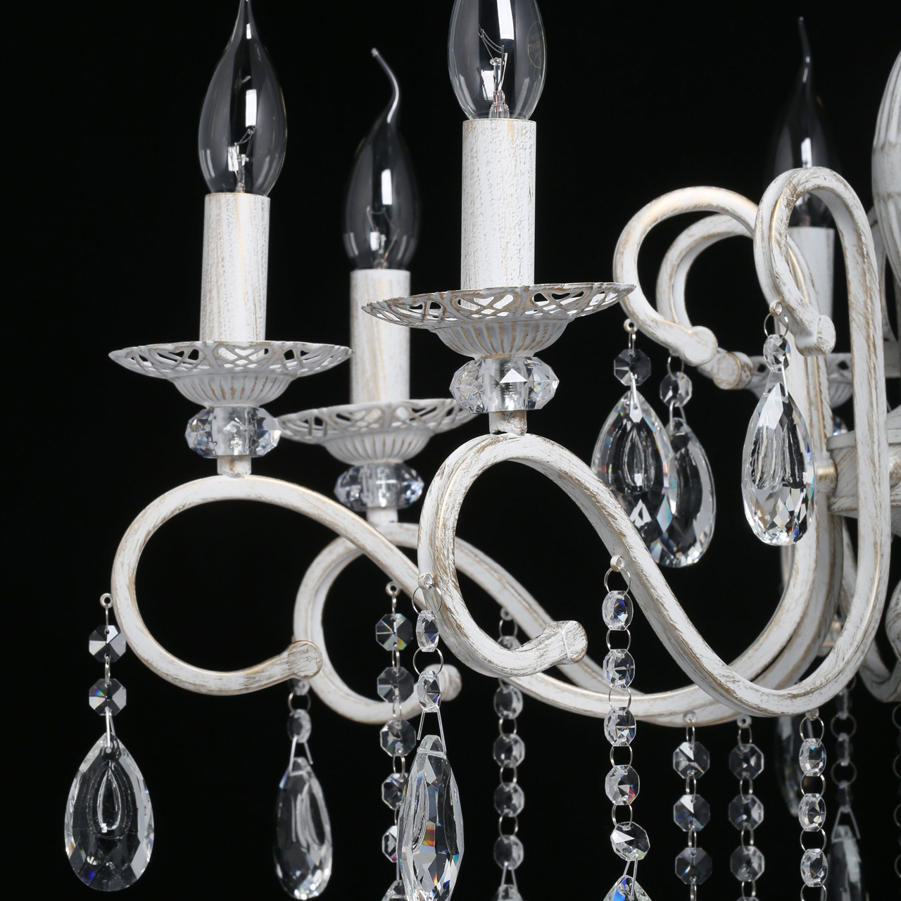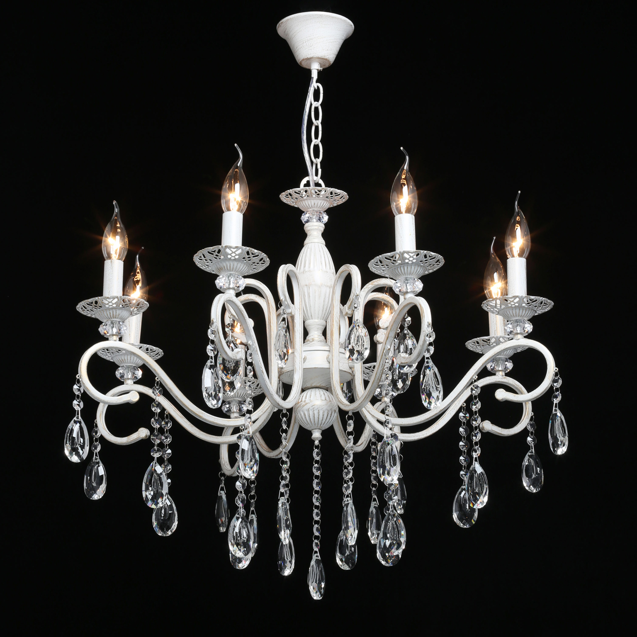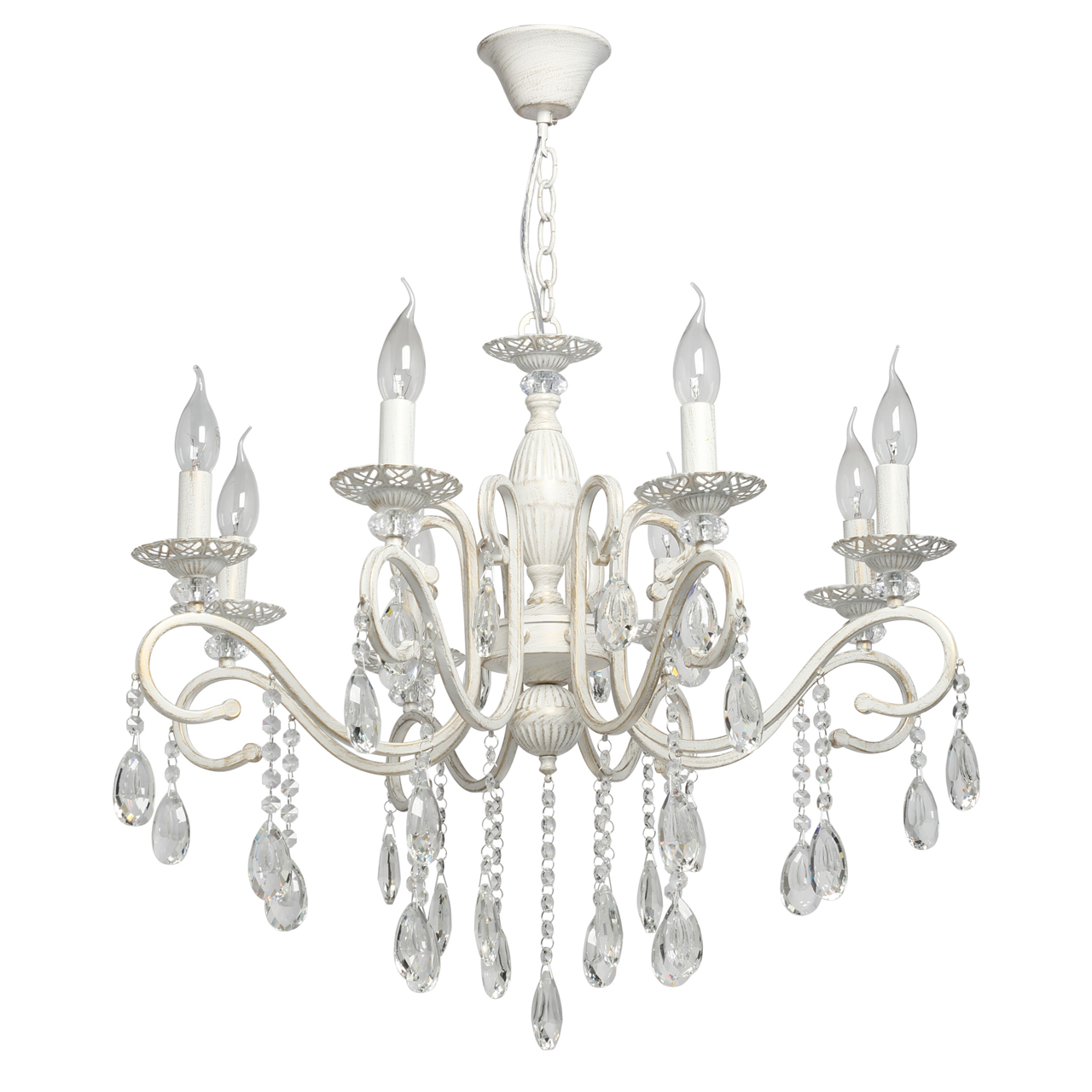 Классическая форма рожков-свечей с наборным основанием белого цвета с золотистой патинойШирокий диаметр у модели на 8 рожков .Оригинальная огранка хрустальных подвесок.Декор рожков с резными розетками придает легкости конструкции.Возможность регулировать высоту светильника, убирая лишние звенья цепи.