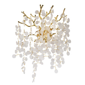 Основание подвесной люстры выполнено по технологии художественного литья из сплава алюминия с цинком и гальванизировано в цвет золота. Люстра декорирована прозрачным фактурным стеклом круглой формы.