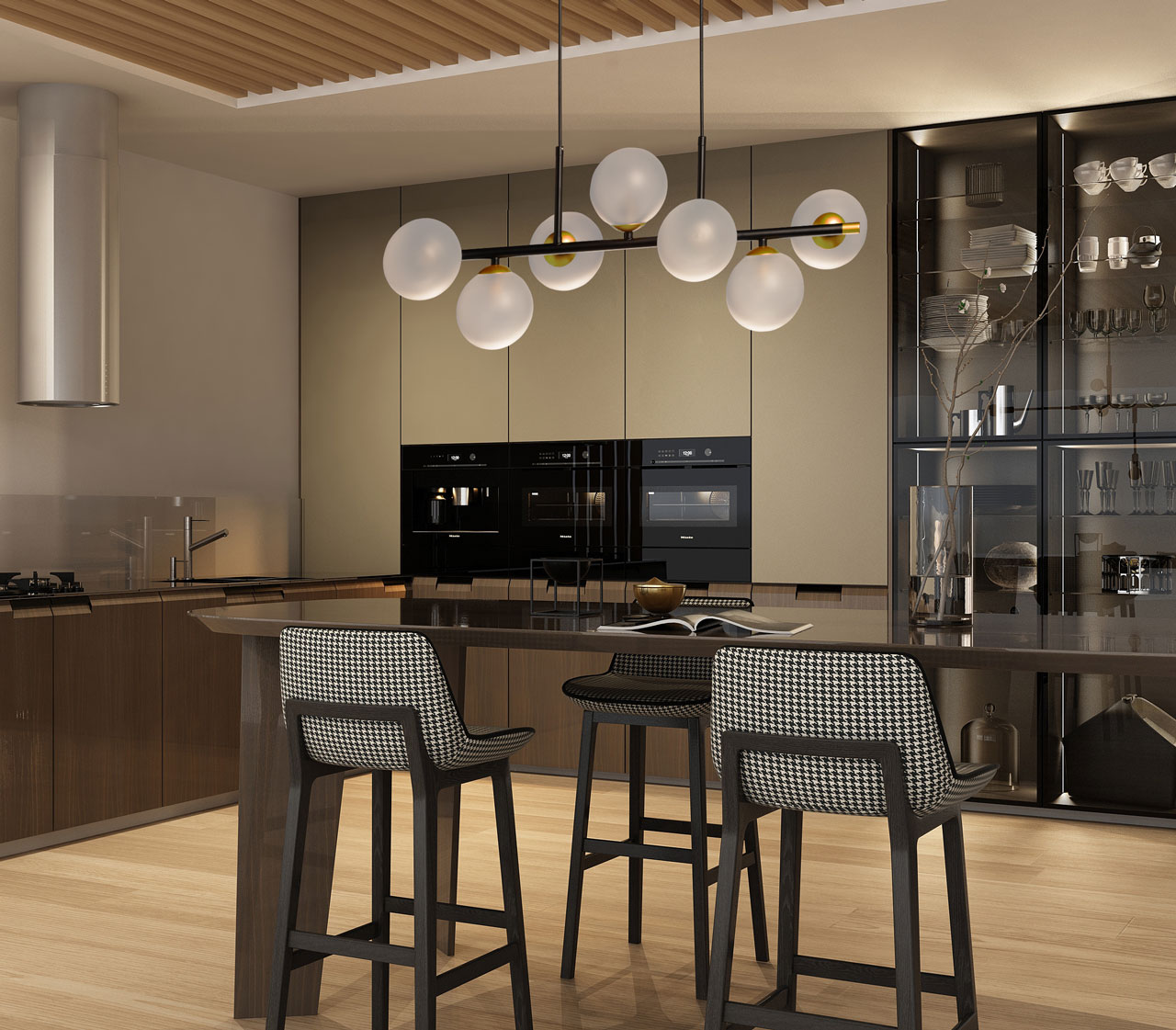 Глубокий черный цвет выгодно выделяет люстру на потолке. Гармоничное сочетание черного и золотого цветов, фактур и форм делает эту люстру ярким акцентом в интерьере. Ассиметричное расположение стеклянных плафонов придает люстре индивидуальность. Матированные плафоны мягко рассеивают свет и создают комфортное освещение. Заменяемые источники света удобны в эксплуатации. Возможность регулировать комфортную высоту.