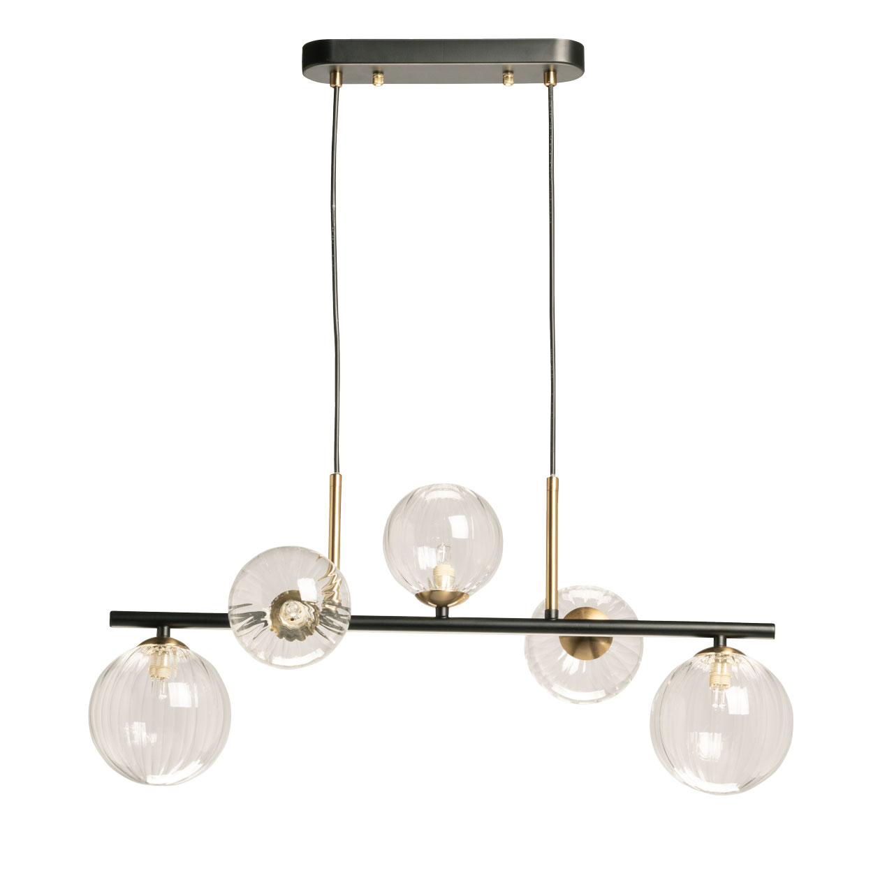 Металлическое основание подвесной люстры окрашено в черный цвет. Отдельные элементы основания гальванизированы в цвет латуни. Люстра декорирована плафонами из прозрачного стекла с линейной фактурой.