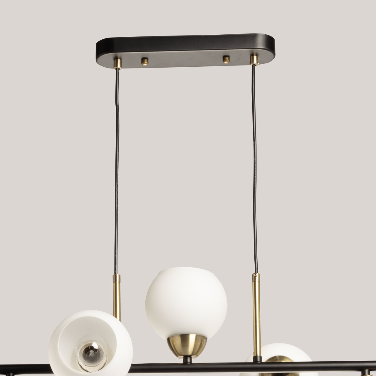 Металлическое основание окрашено в черный цвет. Отдельные элементы основания гальванизированы в цвет античной бронзы. Заменяемые источники света закрыты стеклянными плафонами белого матового цвета.