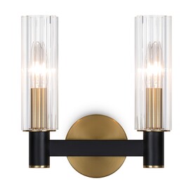 Арматура из металла сочетает два оттенка: черный и латунь. Плафоны цилиндрической формы выполнены из рельефного прозрачного стекла. Актуальная геометрия с настроением американской классики. Источник света – лампа с цоколем E14.