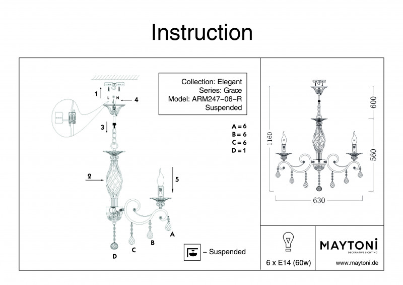 Подвесная люстра Maytoni Grace RC247-PL-06-R — это модель, относящаяся к коллекции светильников характерной чертой которых являются витиеватые сплетения металла. Благодаря наличию 6 источников света с типом цоколя E14, мощностью 60 Вт каждый, при этом общая мощность равна 360 Вт, этот осветительный прибор обеспечивает комфортное и равномерное освещение на площади в 18 квадратных метров, создавая уютную атмосферу в вашем доме.