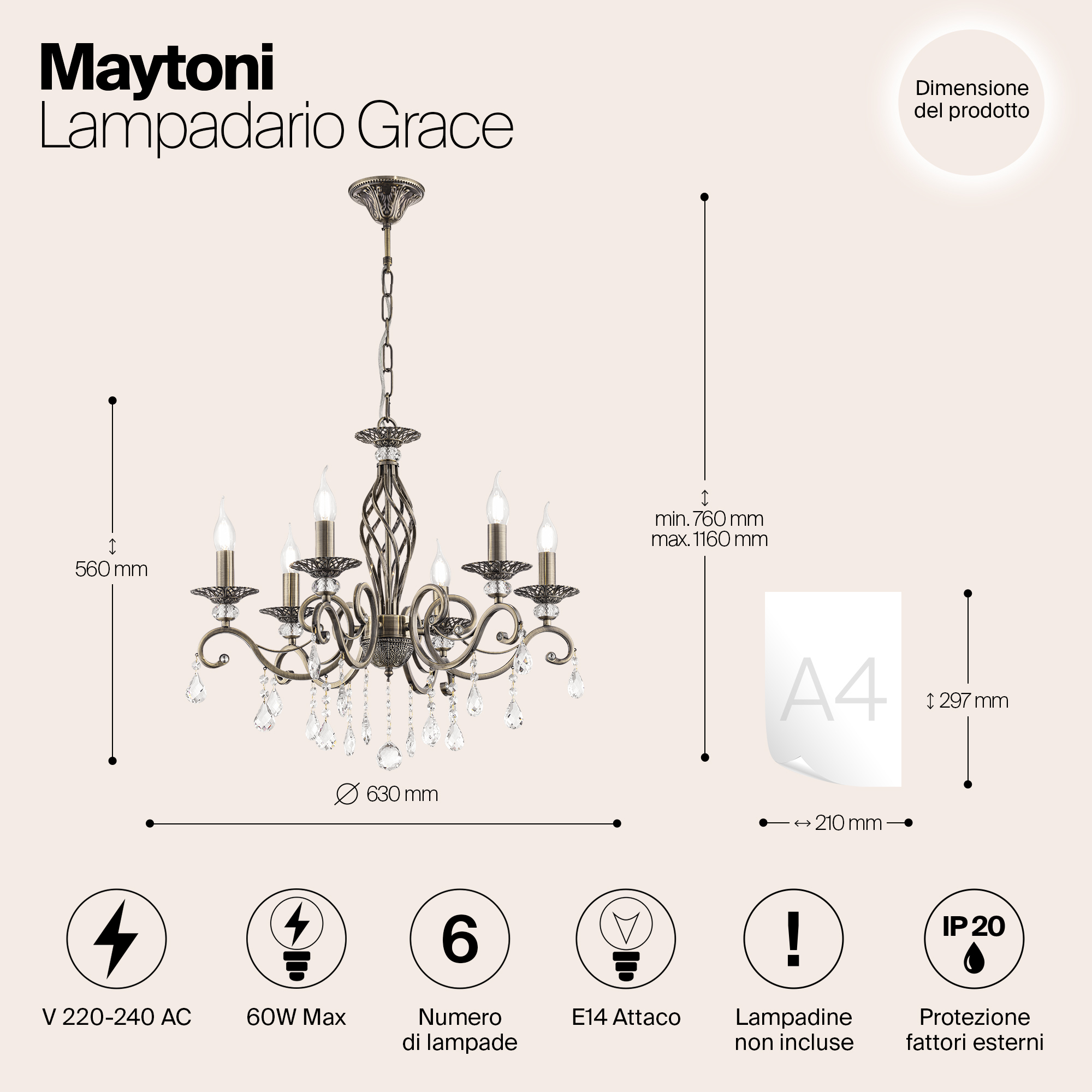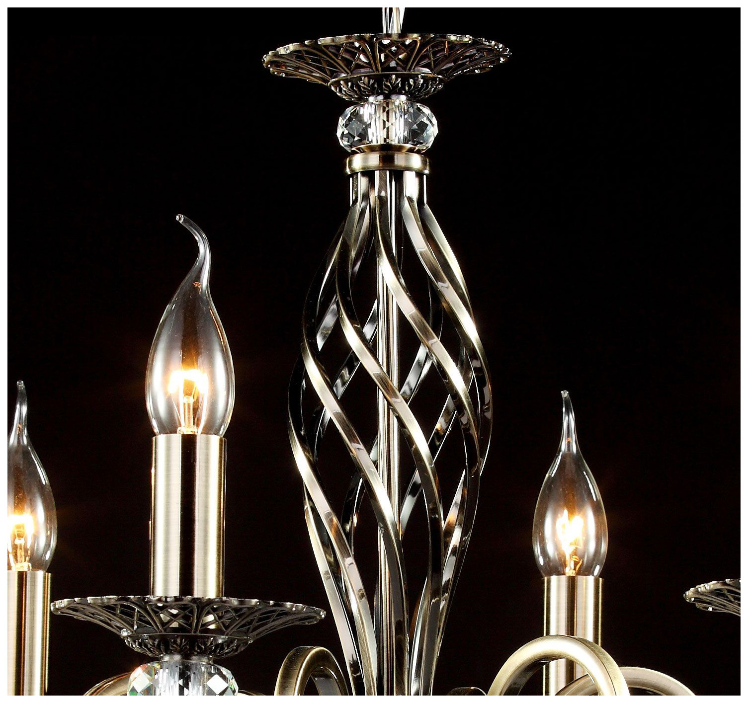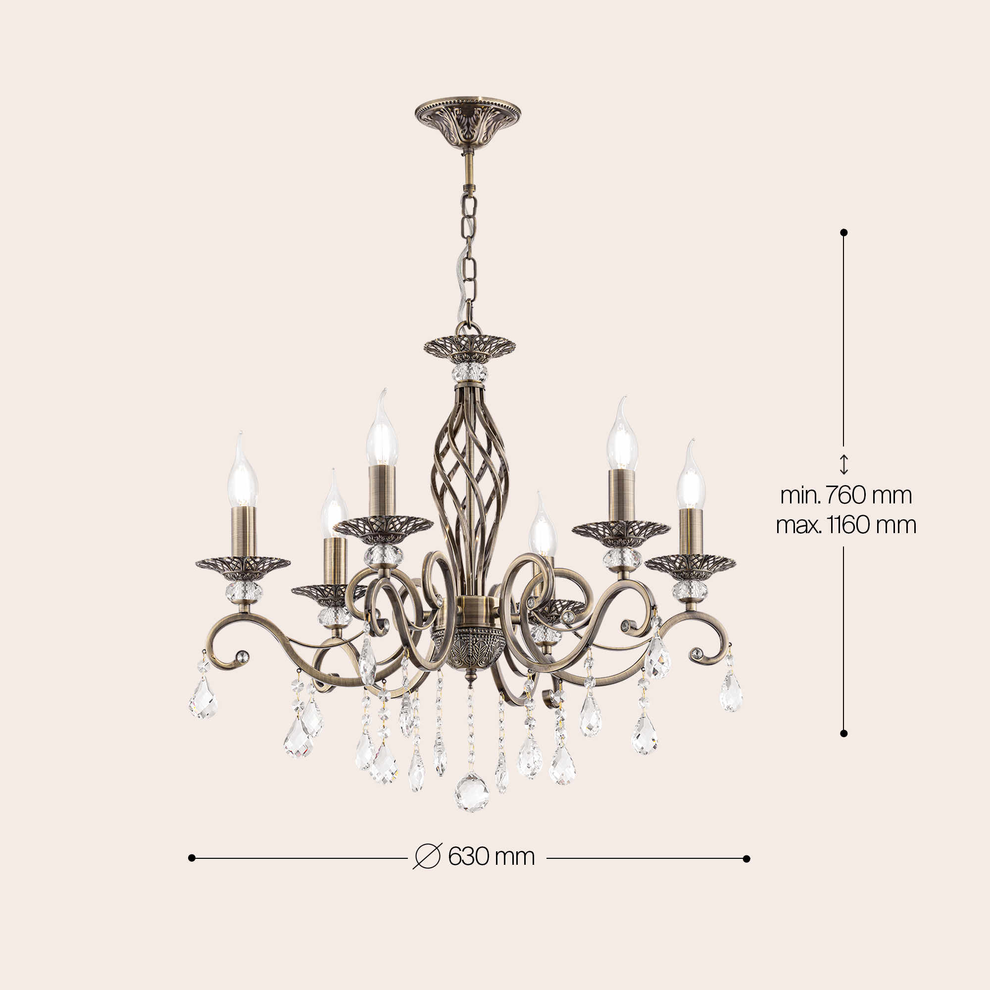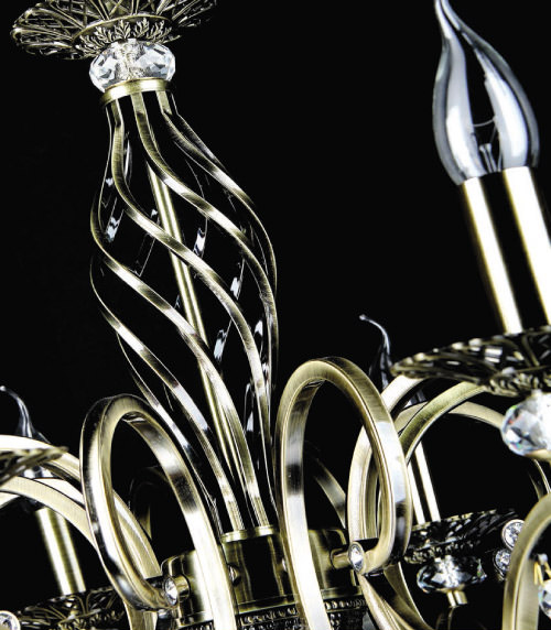 Металлический корпус в бронзовом цвете эффектно сочетается с ажурными подстаканниками. В качестве декоративных элементов используются хрустальные подвесы и бусины с красивой огранкой. Серия представлена моделями как с абажурами, так и без них, напоминая свечи. Благодаря необычному, закрученному по спирали основанию, кажется, что вся конструкция светильника находится в движении. Размеры устройства составляют 630 мм х 1160 мм, что позволяет легко интегрировать его в любое интерьерное пространство. Технической особенностью является регулировка по высоте, меняя длину цепи, в диапазоне от 760 мм до 1160 мм. Модели, входящие в коллекцию Grace RC247, идеально подойдут для размещения в зоне гостиной, спальни, кабинета или офиса, оформленных в классическом стиле, а также для размещения в зоне барной стойки или острова в столовой, позволяя использовать в тандеме подвесные светильники с настольными, настенными и напольными осветительными приборами.