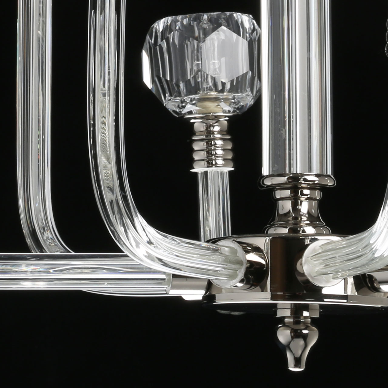 Металлическое основание гальванизировано в цвет никеля. Рожки выполнены из прозрачного выдувного стекла. Центральная ось декорирована прозрачным рельефным стеклом. Светильник декорирован стеклянными плафонами, отлитыми в сложную форму.