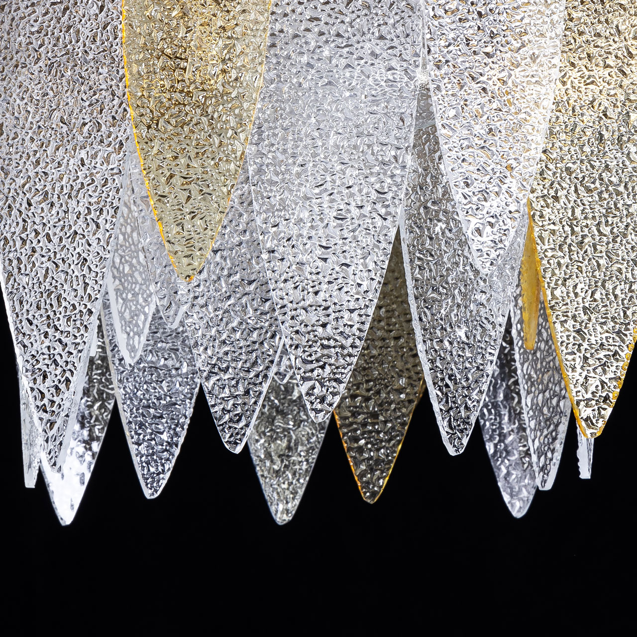 Подвесная люстра привлекает внимание необычным дизайном и гармоничным сочетанием цветов.Актуальный цвет латуни основания дополняет изысканный декор из фактурных стеклянных пластин двух цветов.Фактура вулканического стекла прозрачного и цвета шампань разбивает световой поток на множество ярких бликов, которые создают в комнате романтичную атмосферу.Возможность регулировать комфортную высоту.Заменяемые источники света удобны в эксплуатации.