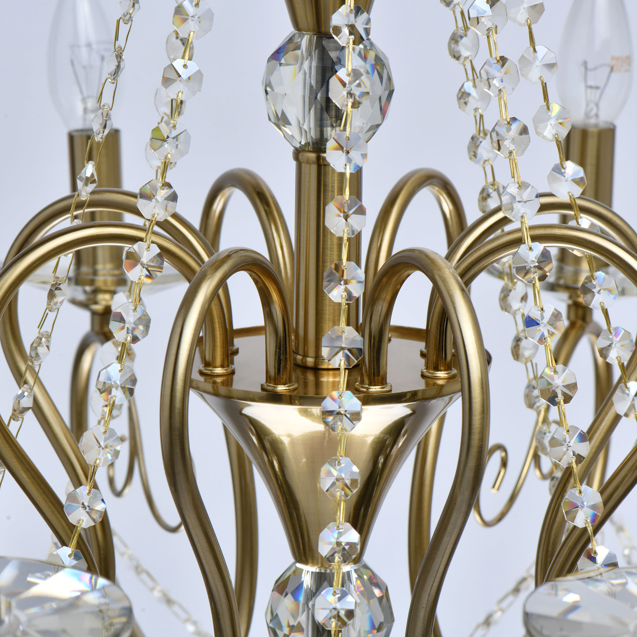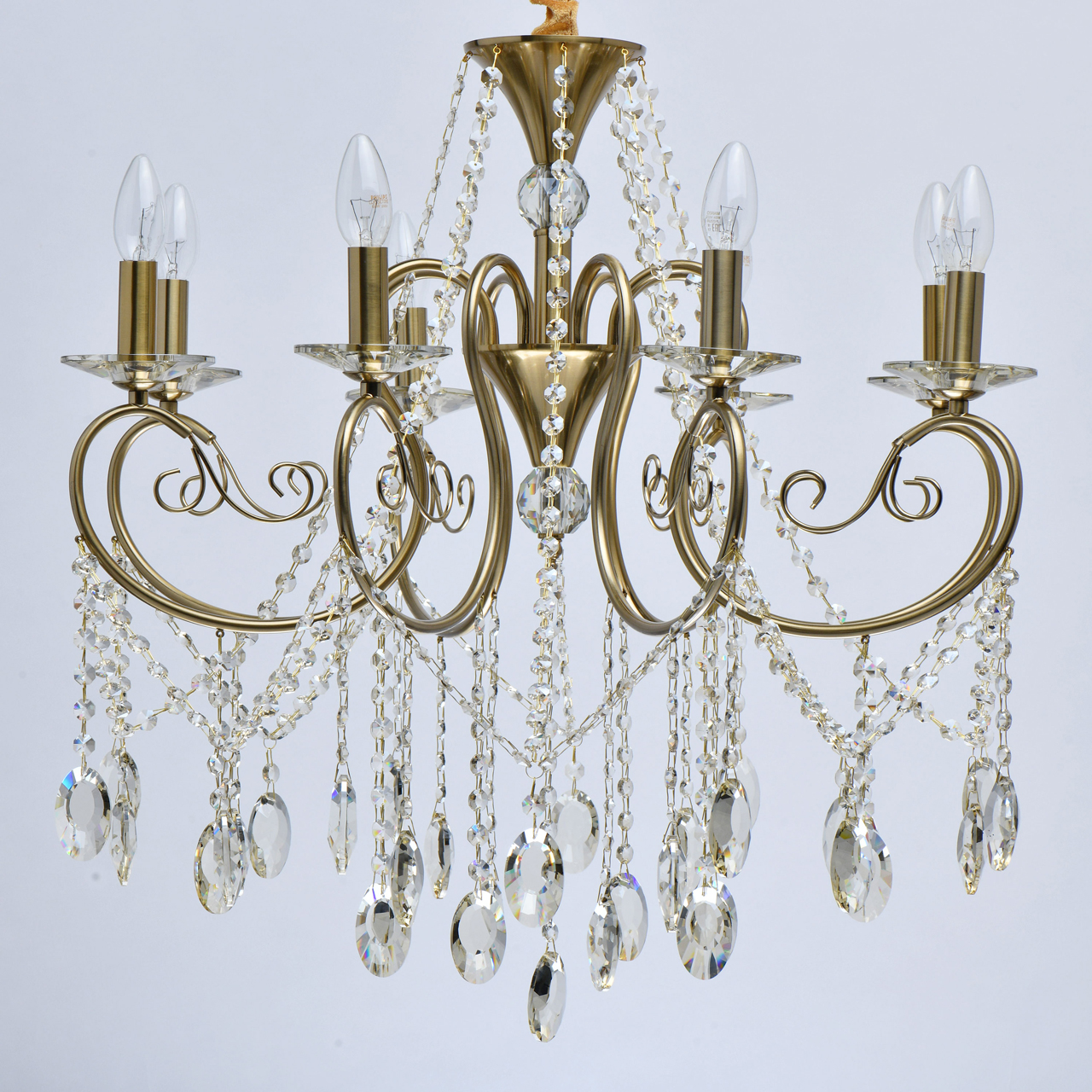 Основание светильника выполнено из металла и гальванизировано в цвет бронзы. Светильник декорирован массивом хрусталя и хрустальными подвесками цвета шампань.