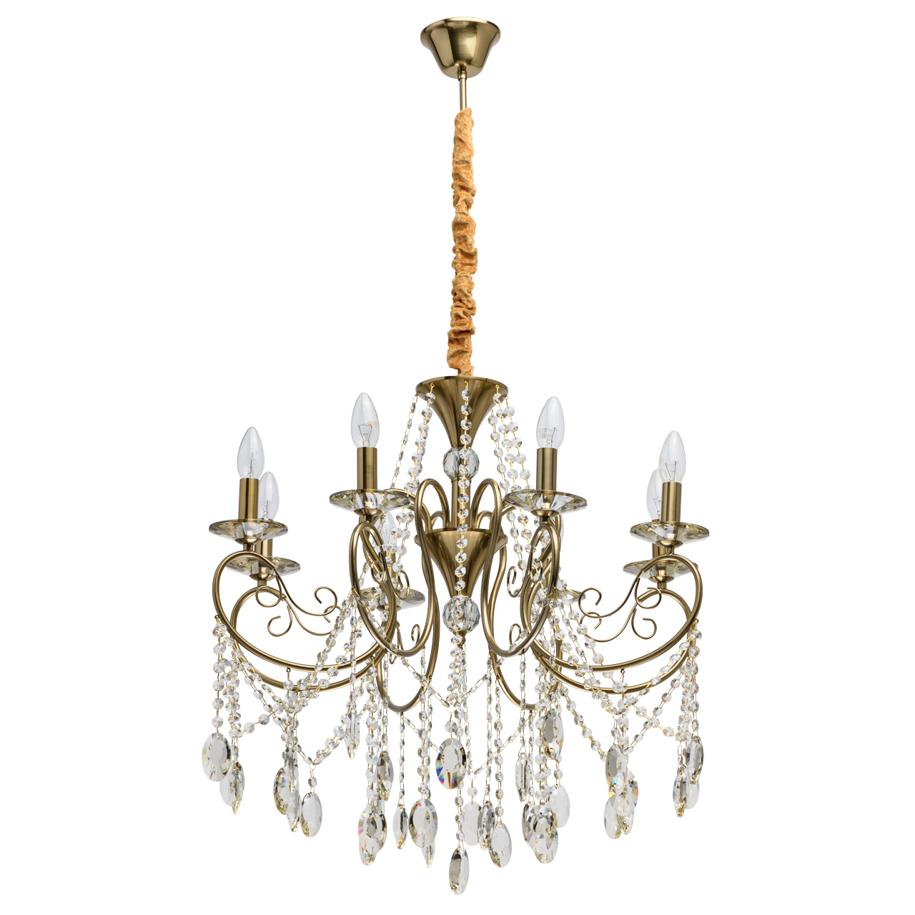 Классическая форма свечи цвета бронзы для интерьеров в традиционном стиле.Хрустальные подвески цвета шампань.Элементы из массива хрусталя, цепочи из хрустальных октагонов создают игру света.Изящные хрустальные розетки.Высота подвеса регулируется за счет звеньев цепи.