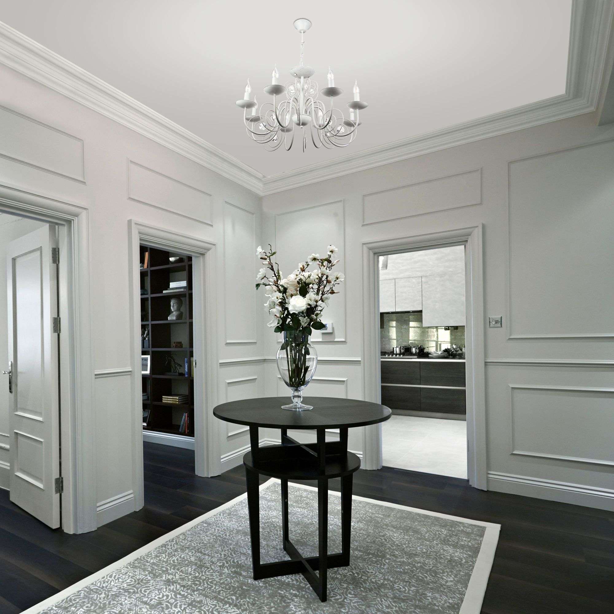 Классическая люстра с хрусталем на 8 рожков в цвете белый с золотом преобразит потолочное пространство и создаст в вашем помещении комфортное полноценное освещение на площади 38 м кв. Изящные формы и классический стиль добавят вашей гостиной утонченного аристократизма.