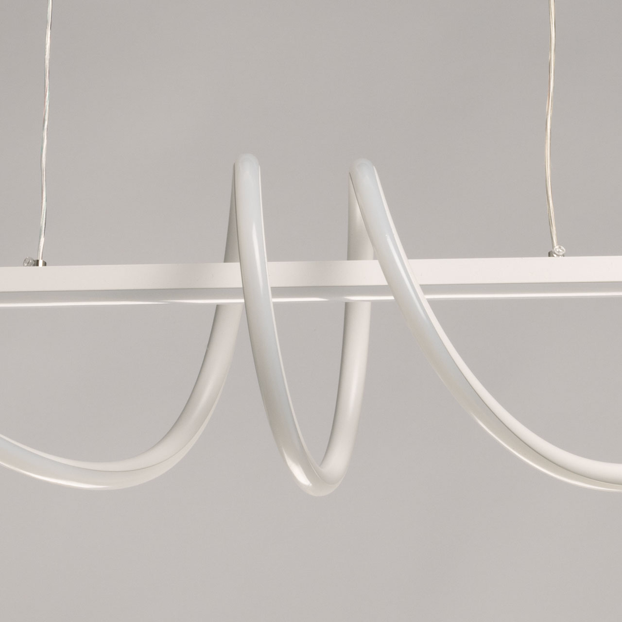 Металлическое основание потолочной люстры окрашено в белый цвет. Плафон люстры выполнен из сплава алюминия с цинком и окрашен в цвет основания. Светодиодные источники света закрыты белым акрилом.