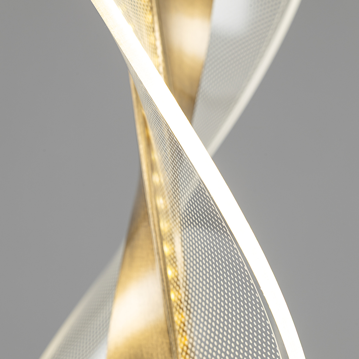 Основание металлическое, оттенка латунь, поверхность матовая. Подвесной светодиодный модуль оригинальной формы можно зафиксировать на разной высоте, создав свой индивидуальный дизайн. Корпус LED-модуля — алюминиевый с гальваническим покрытием, цвет благородная бронза. Витой рассеиватель изготовлен из прозрачного оптического акрила с изящной точечной гравировкой.