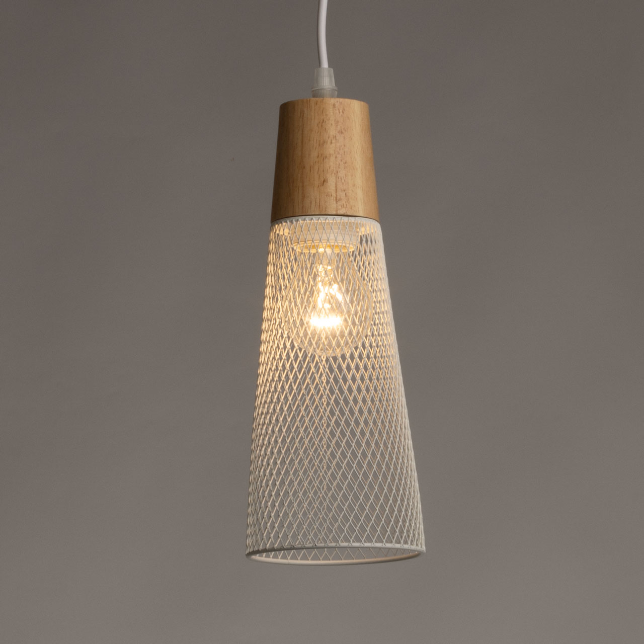 Металлическое основание и плафон подвесного светильника окрашены в белый цвет. Декоративный элемент на подвесе выполнен из металла с имитацией под натуральное дерево.