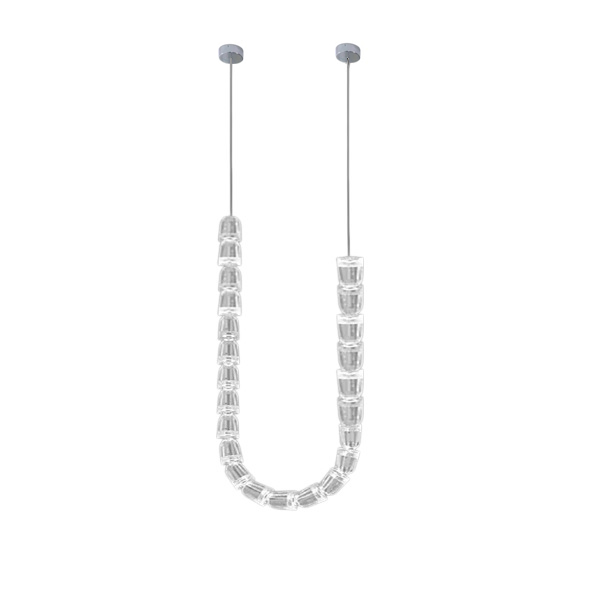 Подвесной светильник Delight Collection 8301P/2000 clear с двумя потолочными креплениями и множеством плафонов из прозрачного акрила, нанизанных на основу как ожерелье . Светильник состоит из 22-х плафонов и в каждом распологается источник света. Общая длина светильника 2 метра. Металлические части хромированные.
