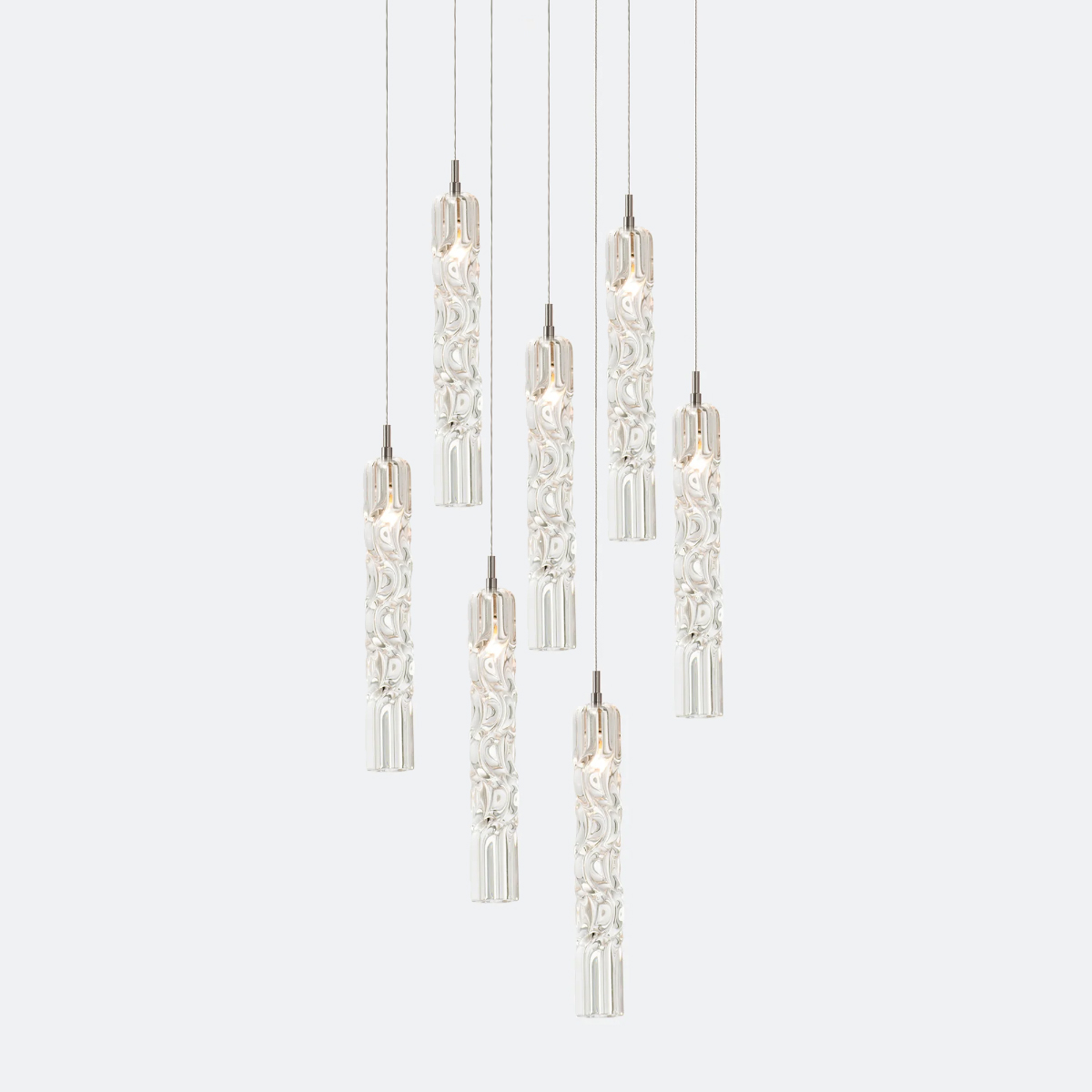 Подвесной светильник Delight Collection OWD272-7 gold с 7-ю подвесами на круглом основании золотого цвета. Высокие узкие плафоны с узорами на поверхности с выполнены из прозрачного стекла. Диаметр плафона 4,7 см, высота 37 см