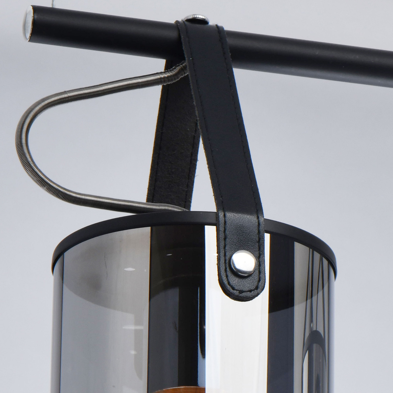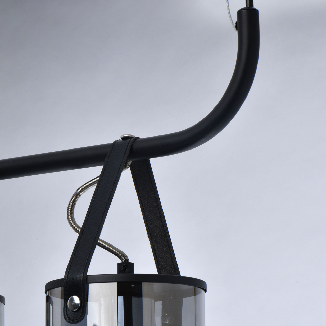 На парящей планке расположены 4 подвеса из стекла цвета антрацита. Основание из металла окрашено в черный цвет. К нему крепятся черные кожаные ремешки, которые и удерживают на весу источники освещения. Свет получается мягким, приглушенным, создает умиротворяющую, романтичную атмосферу. Модель идеально подходит для создания акцентов на конкретных зонах: подсветки обеденного стола, барной стойки, зоны отдыха.