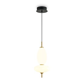 Металлическая арматура черного цвета. Глянцевые белые стеклянные плафоны с перламутровым рисунком и керамическими цветными элементами. LED источник света. Два вида подвеса.