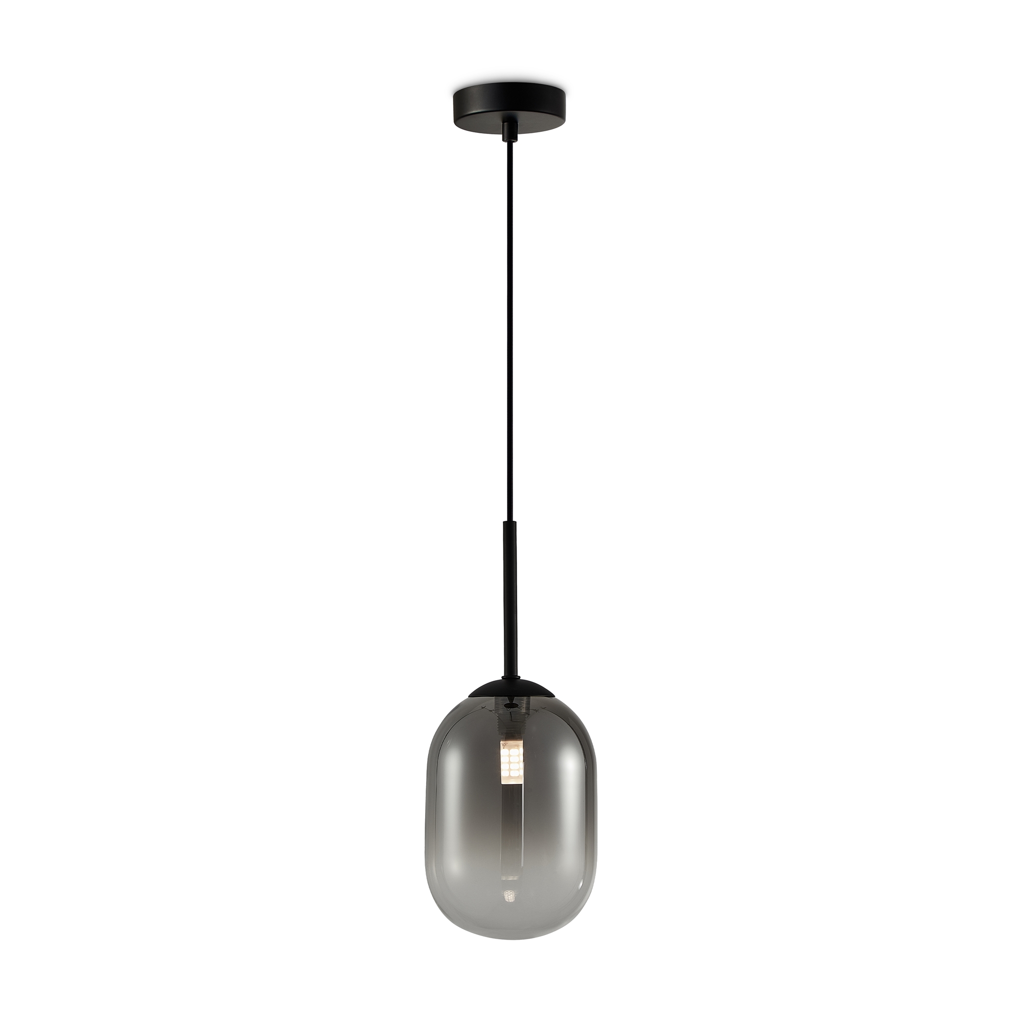 Арматура из металла матового черного цвета. Плафон из стекла с окрасом растяжка. Цвет дымчатый. Модификация — настенные, потолочные и настольные светильники. Источник света — лампа. Цоколь G9.