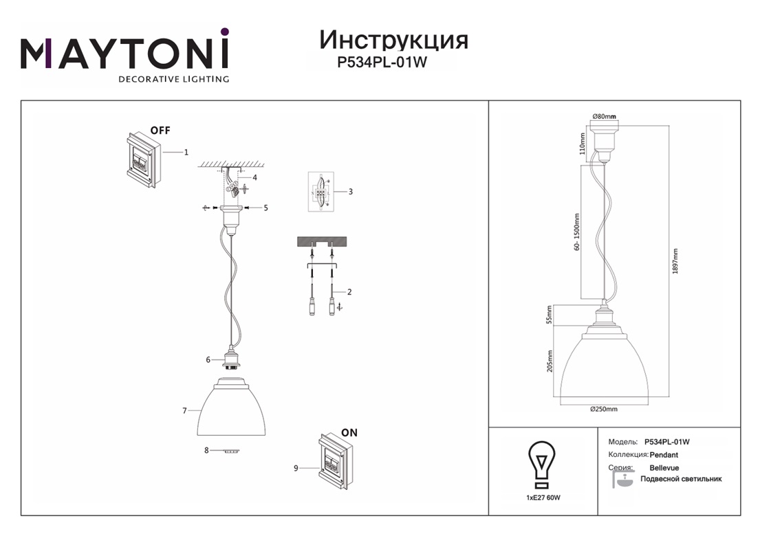 Подвесной светильник Maytoni Bellevue P534PL-01W — это модель, которая станет изюминкой в любом современном интерьере. Благодаря источнику света с типом цоколя E27 и мощностью 60 Вт, этот осветительный прибор обеспечивает комфортное и равномерное освещение на площади в 3 квадратных метра, создавая уютную атмосферу в вашем доме. Арматура и плафоны светильников изготовлены из металла в белом цвете. Порошковое окрашивание с эффектом муара делает поверхность устройства еще более привлекательной. Цветовые решения коллекции: белый, серый и черный. Размеры устройства составляют 250 мм х 205 мм, что позволяет легко интегрировать его в любое интерьерное пространство. Технической особенностью является регулировка по высоте в диапазоне от 400 мм до 1897 мм, что дает возможность, изменяя длину шнура, создавать эффектные инсталляции, располагая подвесы разного цвета серии Bellevue P534PL на разной высоте. Гарантия от производителя составляет 2 года. Способ крепления светильника к потолку на планку позволяет быстро и просто осуществить монтаж, при этом подходит для всех типов потолков, в том числе и натяжных. Стильный дизайн, тип подвеса на трос и техника окрашивания муар подвесного светильника Maytoni Bellevue P534PL-01W делают его особенным элементом декора, который украсит любое интерьерное пространство.