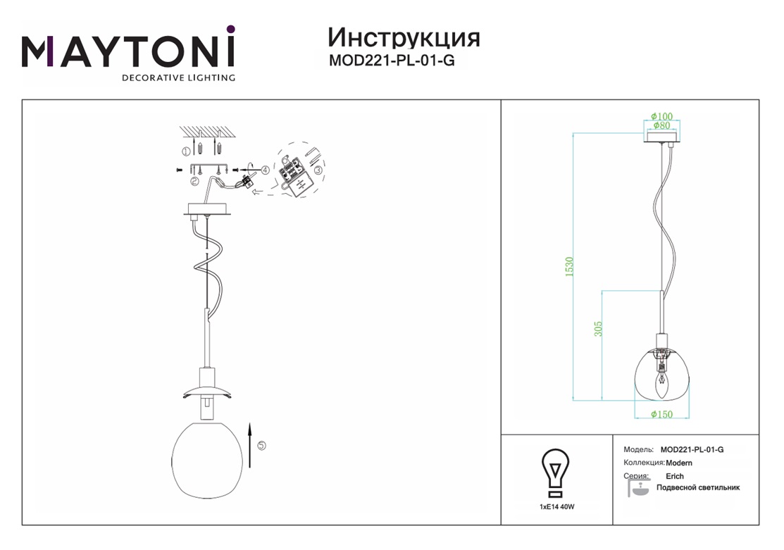 Подвесной светильник Maytoni Erich MOD221-PL-01-G — это надёжный и долговечный осветительный прибор, который станет прекрасным дополнением вашего дома и будет радовать вас своим стильным дизайном и функциональностью на протяжении многих лет.