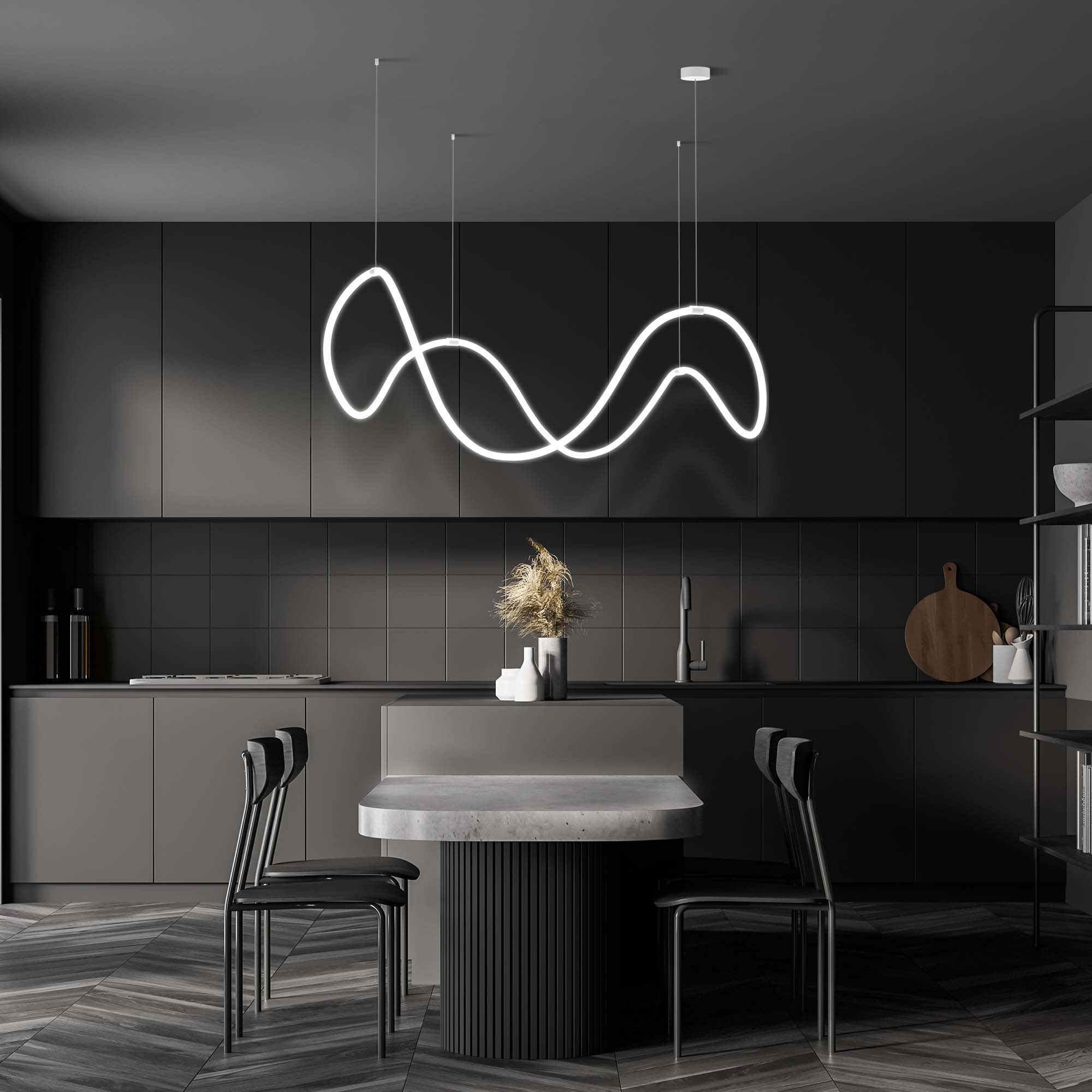 Необычная люстра из гибкого неона Full Light с пультом управления способна в корне изменить привычное восприятие интерьера. Благодаря гибкости неон можно расположить совершенно в разных вариациях.