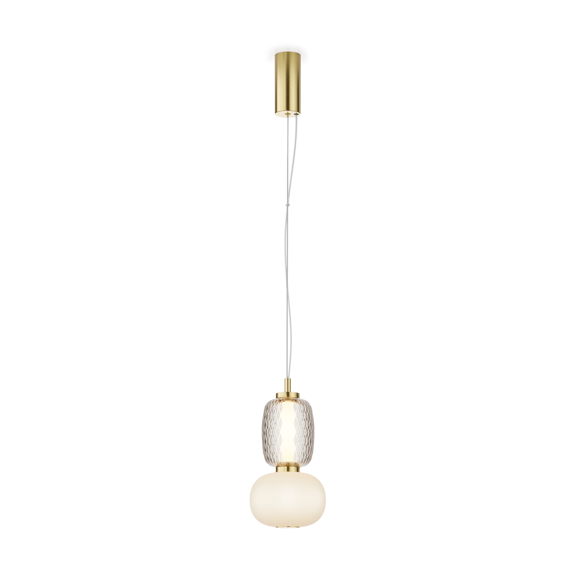 Металлическая арматура, цвет - золото, хром. Микс плафонов округлых и вытянутых форм из белого матового и прозрачного стекла с сетчатым и с линейным повторяющимся рельефным рисунком. Регулируемая высота подвесных моделей, провод - 3 метра. LED-источник света, цветовая температура 3000К.