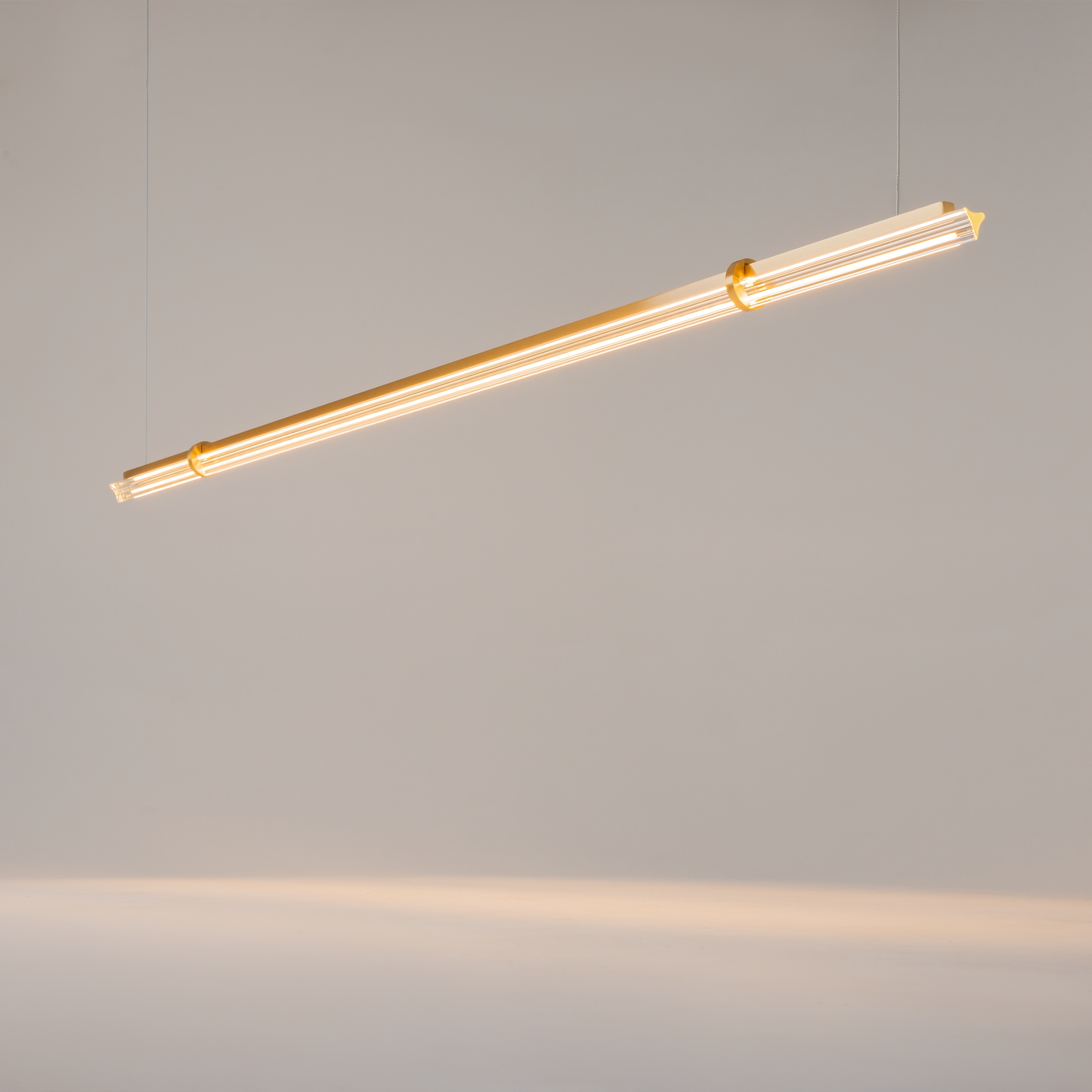 Алюминиевый корпус в золотом цвете латуни с сатинированным финишным покрытием и длинные тонкие плафоны, изготовленные из рифленого стекла, напоминающие блики от свечения кометы, придают светильнику современный и стильный вид, не загромождая пространство, а органично дополняя его. Размеры устройства составляют 180 мм х 3100 мм, что позволяет легко интегрировать его в любое интерьерное пространство. Технической особенностью является регулировка по высоте в диапазоне от 500 мм до 3000 мм. Модели, входящие в коллекцию Plume MOD340PL, идеально подойдут для размещения в зоне гостиной, спальни, кабинета или офиса, оформленных в стиле модерн, а также для размещения в зоне барной стойки или острова в столовой, позволяя использовать в тандеме подвесные светильники с горизонтальным размещением в двух вариантах размеров: длина плафона может составлять 1200 и 1500 мм, и настенный источник света, длиной 600 мм.