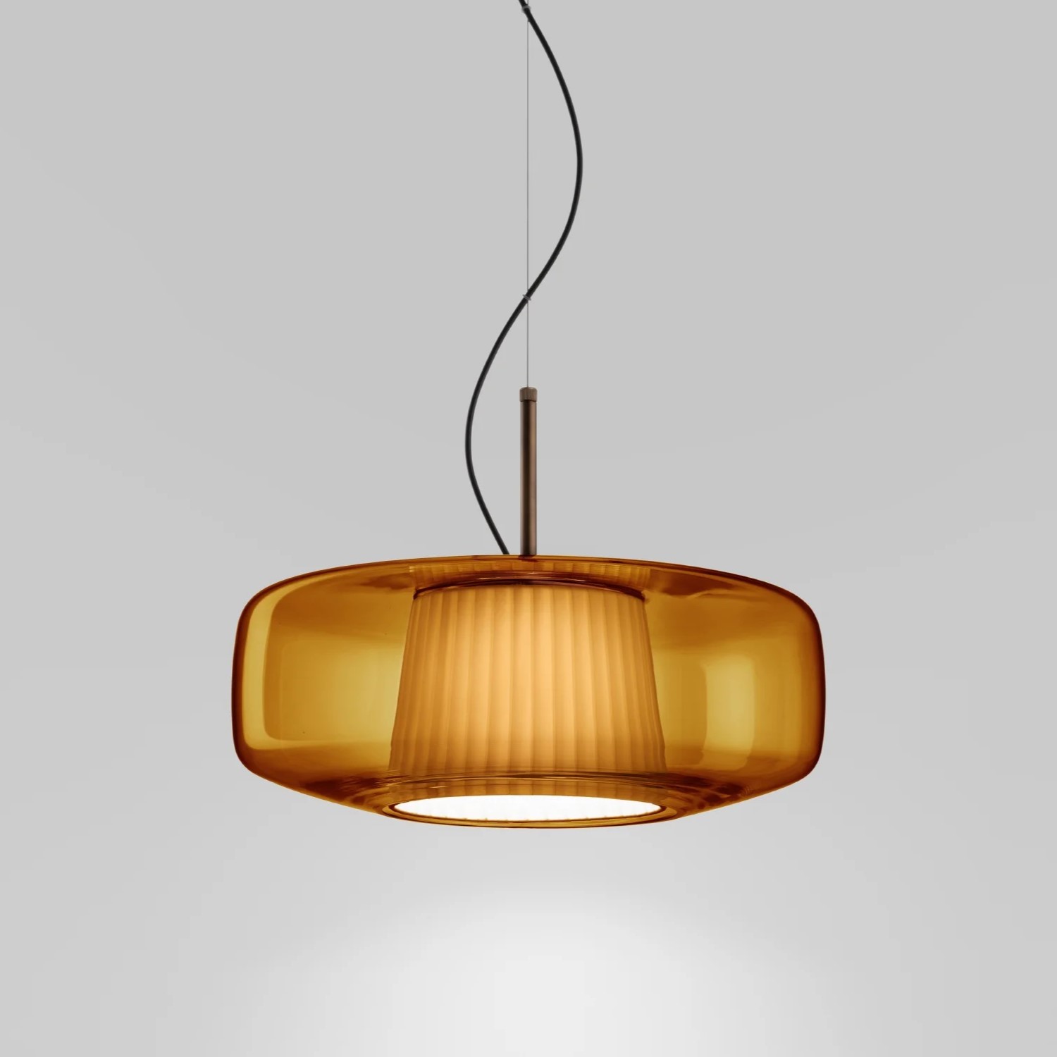Подвесной светильник Vistosi Plisse SP G Amber с арматурой матового бронзового цвета. Выдувное стекло диффузора янтарного цвета скрывает внутренний тканевый абажур и дает жизнь игре прозрачности, цветов и текстур, которые делают Plissè элегантным элементом, способным охарактеризовать и придать индивидуальность помещению, в котором он находится.